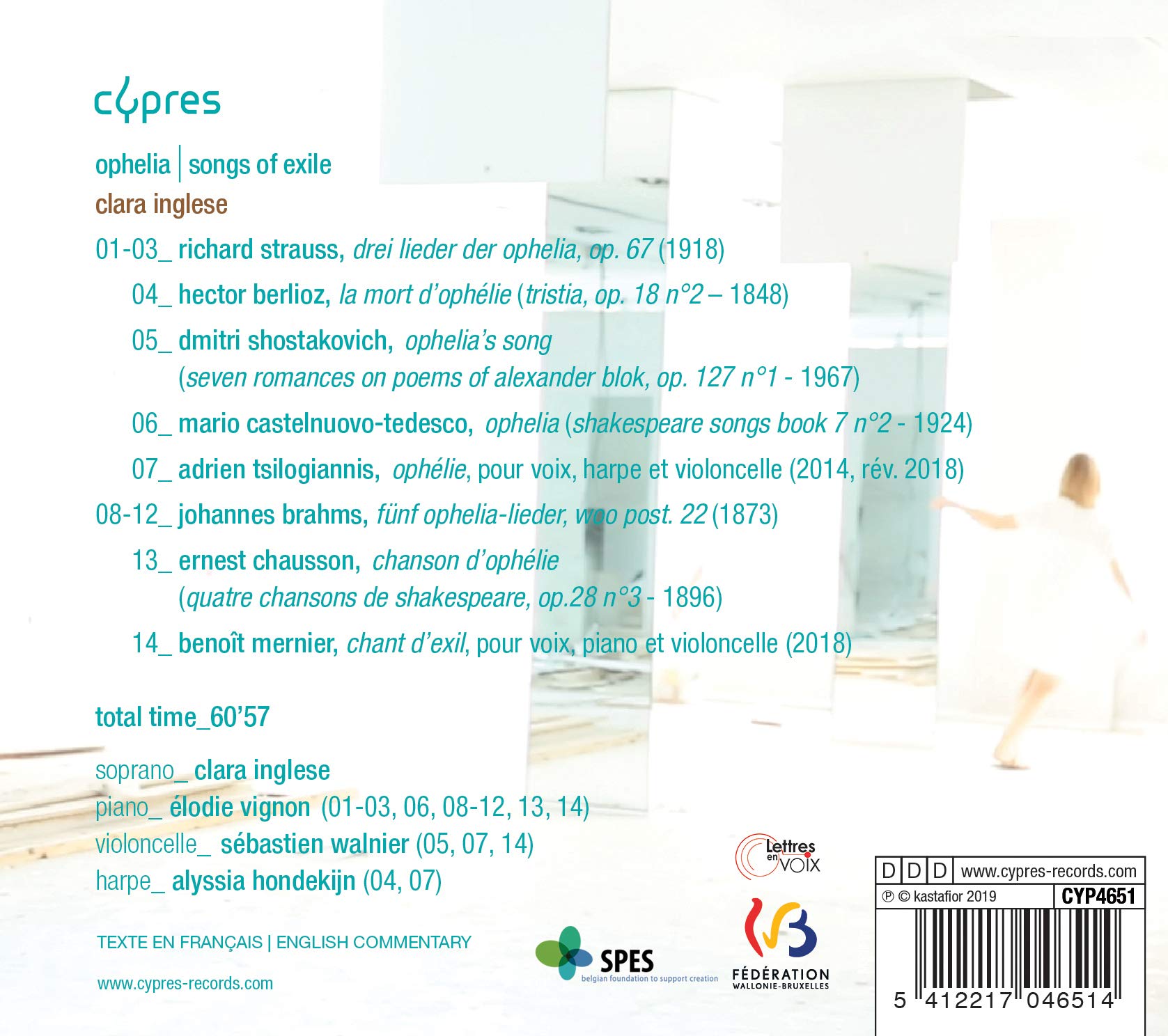 Clara Ingese was twenty when she discovered the multi-facetted personality of Ophelia who breathes a special energy into her desire to sing. Today she imagines through an album, from the 19th musical century, a journey between worlds, questioning Ophelia's madness within the torments and interrogations of our time. Thus was born the last piece, Chant d’exil, commissioned from François Emmanuel (for the text) and Benoît Mernier (for the music). This poetic allegory reflects the fluid gap between the boundaries and sings of the tragedy of an errant Ophelia, as though addressing the memory of our deceased human siblings who drowned on the path of exile. Belgian-Italian soprano Slara Inglese has performed on stages all across Europe. She is especially involved in theater and contemporary creations.