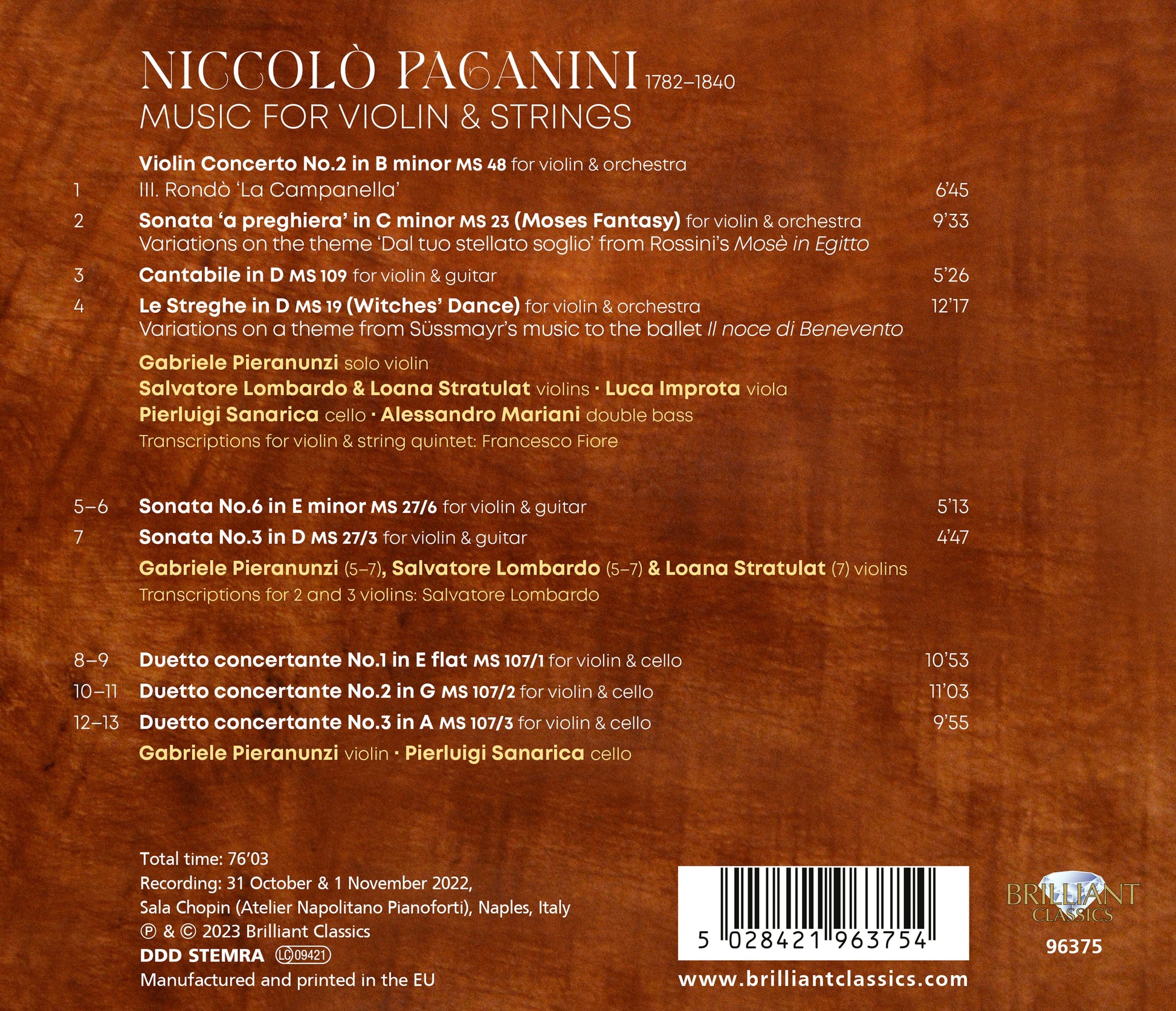 Paganini was the first great ‘star’ of instrumental music, the precursor of the rock stars of today, able to induce collective hysteria as well as to dictate fashion and to influence the behaviour of entire generations. He did this by transforming the violin into an orchestra of multiple voices and timbral experimentation, in other words, stretching the very limits of what a single instrument could do. This programme is particularly interesting, both for the quality of the performances as well as the new chamber-string versions created by Francesco Fiore and Salvatore Lombardo. It also juxtaposes extremely popular Paganini works alongside compositions not very often heard in the concert hall but which help flesh out our understanding of the artistry of a composer too often misjudged as merely an acrobat of the violin. In four of Paganini’s best-known compositions – the ‘Campanella’ (Bell) movement from the Violin Concerto No.2, the Moses Fantasy, the Witches’ Dance and the Cantabile – the solo violin is here accompanied by a string quintet. In the first three, the string quintet stands in for the orchestra with a consequent lightening of accompaniment. In the Cantabile, the original of which was for violin and piano (Paganini’s only piece to be accompanied by keyboard rather than guitar), the ‘heavier’ quintet accompaniment still manages to retain a discreet sense of enjoyable sophistication. The next two works, Nos. 6 and 3 of the 6 Sonatas Op.3 for violin and guitar, are presented here in transcriptions for two or three violins. These two sonatas, written in the salon style typical of the age, delight the listener with the conversational nature of the violin writing. Finally come three compositions in their original versions, providing an excursion into a lesser-known, but still very interesting, area of Paganini’s chamber output. The three Duetti concertanti for violin and cello were written for the enjoyment of amateur players, each comprising two movements