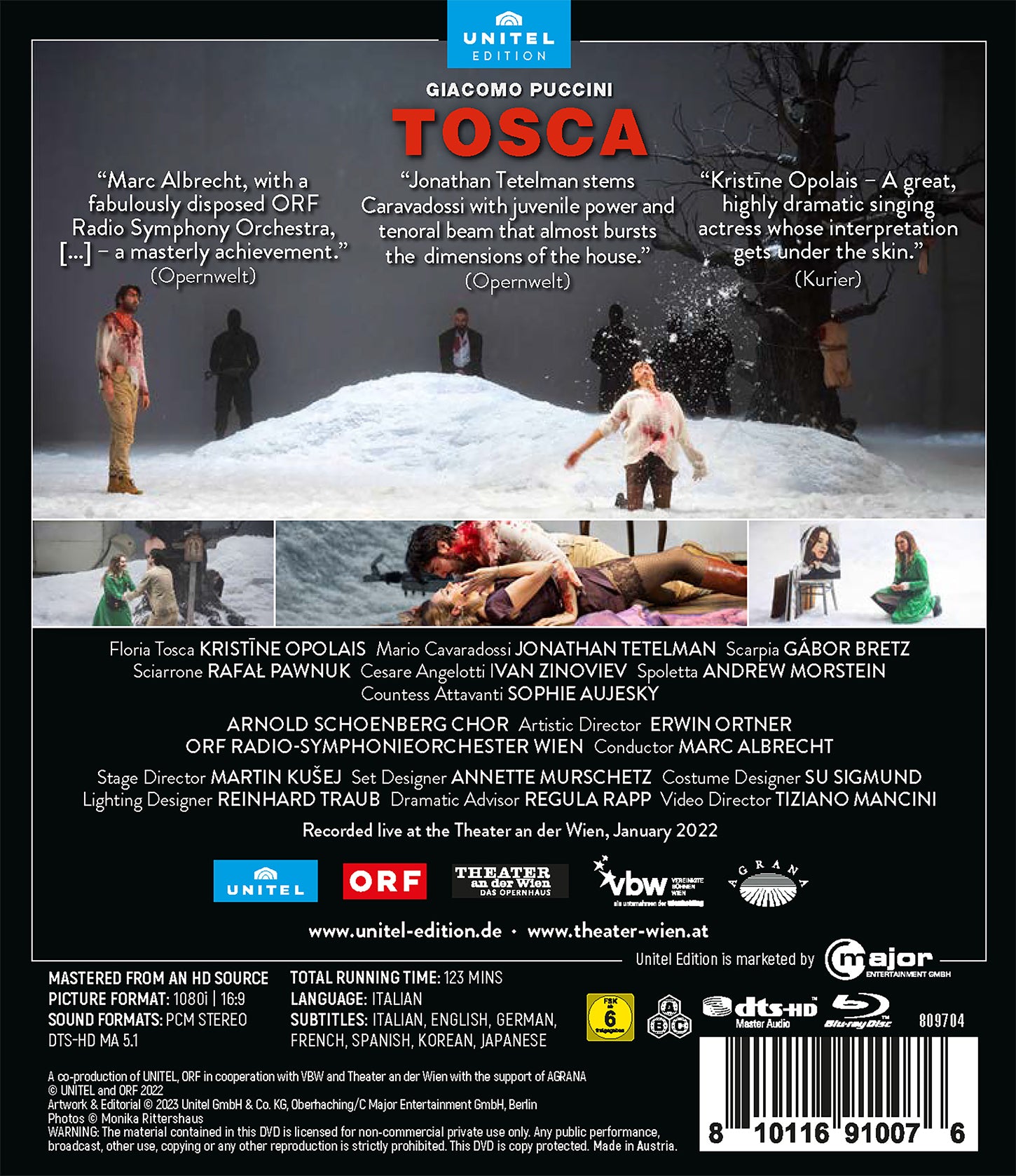 It is impossible to imagine today’s opera repertoire without Puccini’s Tosca, but rarely has an opera been so brutal: Murder, torture and love, jealousy and passion – everything is present in abundance. When it was written in 1900, this thriller set to music caused considerable controversy due to the political figureheads involved. Only much later the story about the deeply religious Tosca, the passionate Cavaradossi and the sadistic Scarpia was interpreted as the psychological drama it was meant to be. The drama on stage is accompanied from the orchestra pit by Marc Albrecht conducting the ORF Vienna Radio Symphony Orchestra by pointed sketches of the characters, but also - as typical for Puccini - by lyrical turns and beautiful melodies that make this opera shocker unique. “Marc Albrecht, with a fabulously disposed ORF Radio Symphony Orchestra, [...] – a masterly achievement.” (Opernwelt). Next to Kristine Opolais, “a great, highly dramatic singing actress whose interpretation gets under the skin” (Kurier), sings the discovery of the evening, “the young tenor Jonathan Tetelman stems Caravadossi with juvenile power and tenoral beam that almost bursts the dimensions of the house.” (Opernwelt).