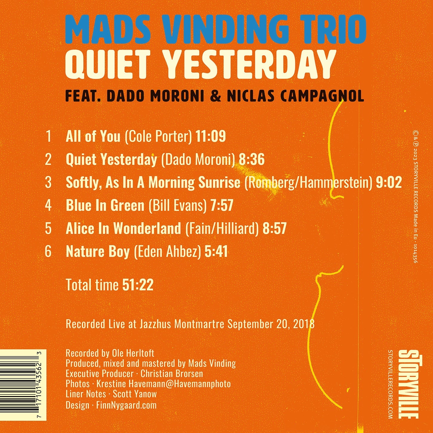 Danish bassist Mads Vinding, Italian pianist Dado Moroni and Italian / Swedish drummer Niclas Campagnol join forces to deliver an exceptional, previously unreleased live performance in the form of the brand new album Quiet Yesterday on Storyville Records on November 17, 2023. In 2018, these three musical virtuosos united to record a live performance at the iconic Jazzhus Montmartre in Copenhagen. This release features five standards and an original composition by Moroni titled Quiet Yesterday. Their remarkable interplay showcases the power of jazz as a universal language and the profound connection that can be forged between artists who, despite not having worked together previously, communicate effortlessly on stage. On this recording, Vinding, Moroni and Campagnol display a level of synergy that is nothing short of awe-inspiring. Their seamless collaboration evokes the impression of a well-seasoned trio, one that has honed their craft over several years. What makes this trio’s performance truly extraordinary is the fact that Moroni had never recorded with either Vinding or Campagnol prior to this, yet their musical chemistry is palpable, making the music sound effortless and natural. Throughout the recording, Vinding, Moroni and Campagnol communicate with an uncanny closeness, crafting music that is subtle, emotionally resonant, spontaneous and endlessly swinging. Each member of the trio has a distinguished track record of elevating the music of others across a multitude of settings throughout their careers. Their shared commitment to pushing boundaries, avoiding clichés, and exploring new creative horizons is evident in their music. What’s most remarkable is that, despite spanning three different generations, their collective chemistry feels timeless and boundless. Bassist Mads Vinding, born in 1948, is a prominent figure on the jazz scene. Over the years he has collaborated with an impressive roster of jazz greats, including Duke Jordan, Dexter Gordon, Enrico Pieranunzi, Toots Thielemans and many more. Pianist Dado Moroni, born in 1962, is one of Europe’s most loved pianists. He has played as sideman with just about everyone from Clark Terry to Freddie Hubbard, but today he is considered a modern European giant that among many projects plays duo with Kenny Barron and trio with Eddie Gomez and Joe LaBarbera. Drummer Niclas Campagnol, born in 1973, comes from a long musical lineage. His versatility and musicality makes him a sought after musician that has worked with Thomas Fonnesbæk, Didier Lockwood and Antonio Farao. Quiet Yesterday is a testament to the enduring power of jazz and the boundless creativity that can emerge when three exceptional musicians come together to create music that transcends generations. But as always it is the singing bass a stunning virtuosity of Mads Vinding that shines through. This is jazz of the highest order!