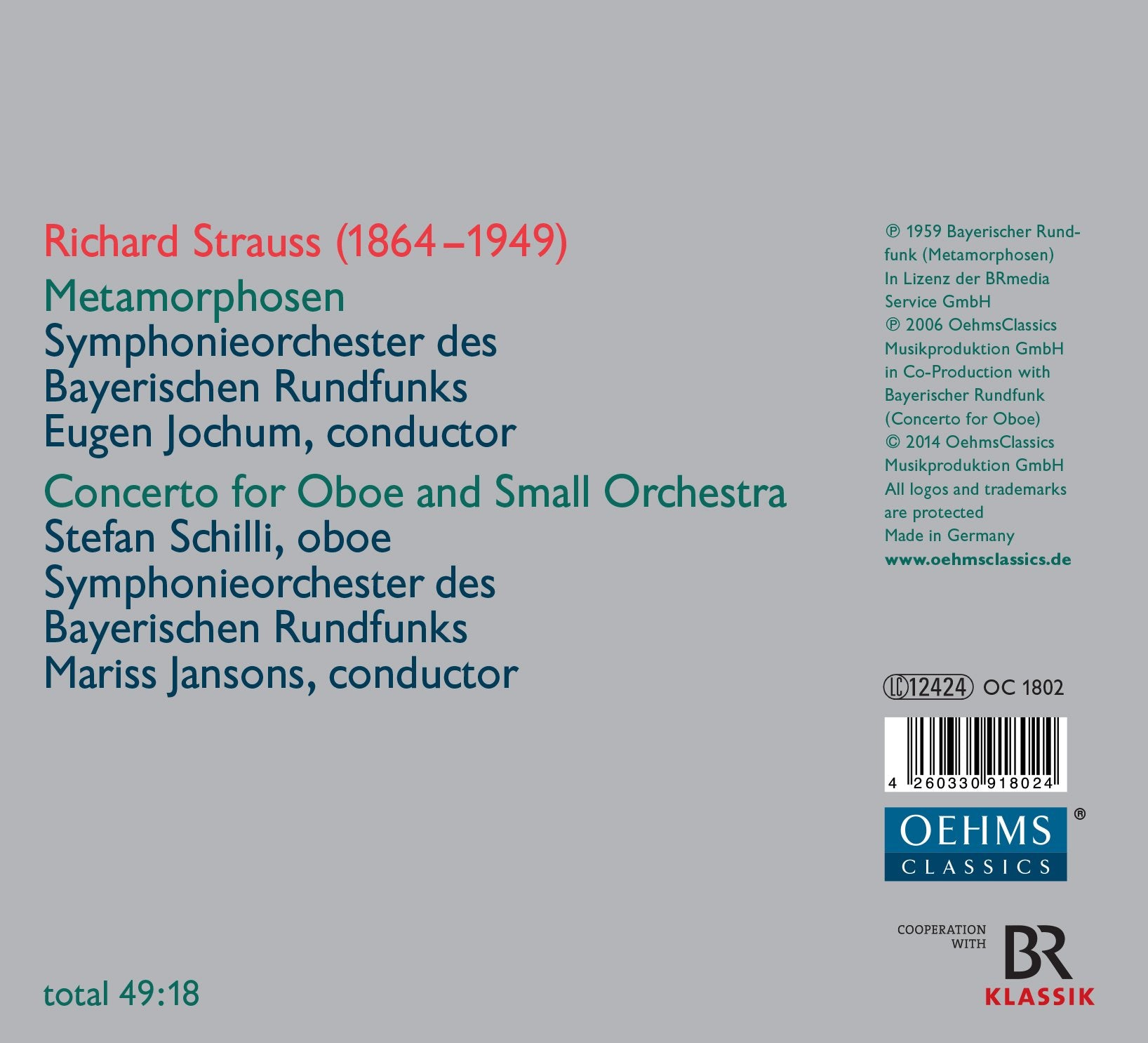 Richard Strauss’ Metamorphoses for 23 solo strings, his last great orchestral work, was given its premiere on 25 January 1946 in Zürich, Switzerland under the direction of the work’s dedicatee, the eminent Swiss musician Paul Sacher (1906-99). + Here, the conductor Eugen Jochum (1902-87) conducts the dynamic Bavarian Radio Symphony, the orchestra he helped found. + The Concerto for Oboe in D, also one of the composer‘s late works, received its premiere a mere one month after Metamorphoses, also in Zürich. + The performers here are once again the BRSO and their solo oboist Stefan Schilli.