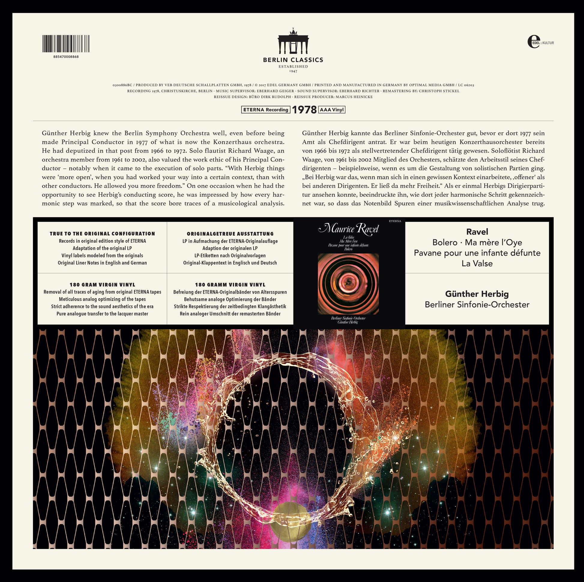 Günther Herbig knew the Berlin Symphony Orchestra well, even before being made Principal Conductor in 1977 of what is now the Konzerthaus orchestra. He had deputized in that post from 1966 to 1972. Solo flautist Richard Waage, an orchestra member from 1961 to 2002, also valued the work ethic of his Principal Conductor – notably when it came to the execution of solo parts. “With Herbig things were ‘more open’, when you had worked your way into a certain context, than with other conductors. He allowed you more freedom.” On one occasion when he had the opportunity to see Herbig’s conducting score, he was impressed by how every harmonic step was marked, so that the score bore traces of a musicological analysis. Solo flautist Richard Waage, an orchestra member from 1961 to 2002, also valued the work ethic of his Principal Conductor – notably when it came to the execution of solo parts. “With Herbig things were ‘more open’, when you had worked your way into a certain context, than with other conductors. He allowed you more freedom. You could offer more as an individual. I liked that a lot.” On one occasion when he had the opportunity to see Herbig’s conducting score, he was impressed by how every harmonic step was marked, so that the score bore traces of a musicological analysis. “This was the mathematical impulse” characteristic, he judged, of Herbig’s way of working. This architectural, formally structured approach to the music fitted well with the recording technique of those days, which did not allow breakdown into such small steps as today. Arches of tension thus sound more plausible, because there are fewer pieces to put together. “When you have long takes, of course that makes it all more organic,” concludes Richard Waage. It will surely have been these working conditions and the conductor’s specific style that made it possible, even in such an unpretentious piece as the Pavane, “to bring out the character of mourning”, which so moved Jürgen Kögel and other participants. This recording contains Ravel’s symphonic works La Valse, Ma Mère l'Oye, Pavane pour une infante défunte and last but not least the famous Bolero.