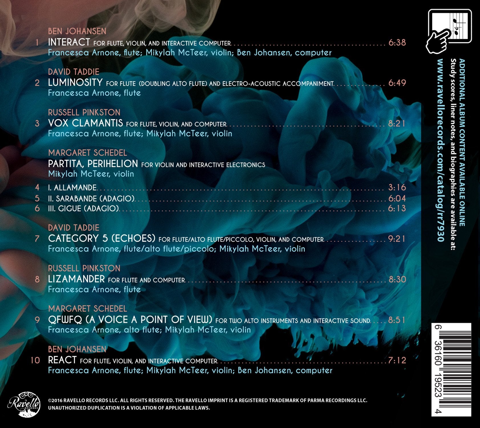 This collaborative album, REACT, is the first from flutist Francesca Arnone and violinist Mikylah McTeer. The tracks on this album explore all timbres and ranges of both of these instruments, as well as electronic techniques, in an exciting journey through experimental and traditional sounds. Mikylah McTeer is professor of violin at West Virginia University, and was previously concertmaster of the San Juan Symphony in Durango, CO. Francesca Arcone is the principal flutist of the Waco Symphony, as well as professor of flute at Baylor University. She also frequently performs with the Brazos Ensemble.