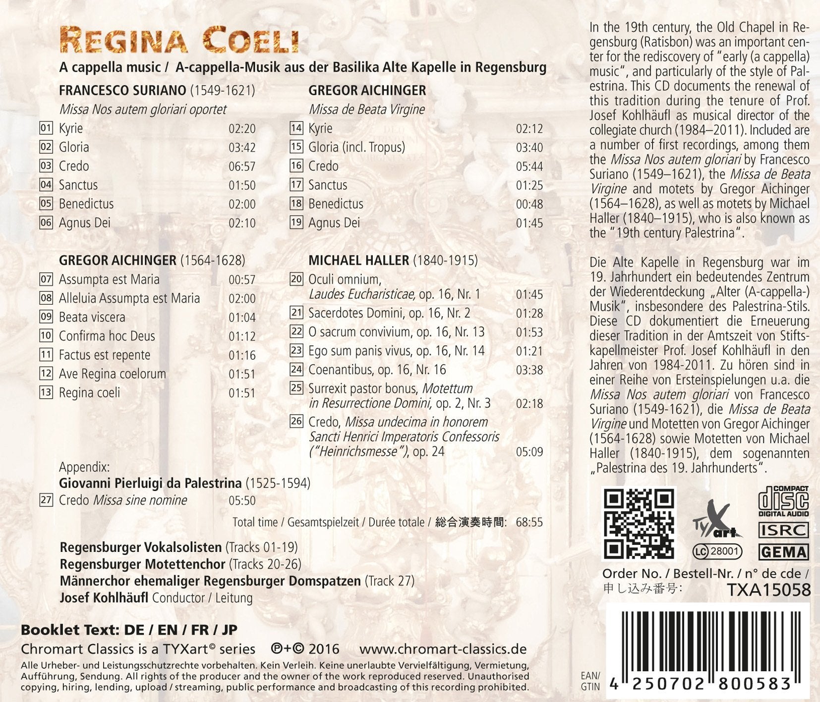 The Old Chapel in Regensburg was an important hub for the rediscovery of early a cappella music during the 19th century. This album explores the tradition as it was rediscovered during the tenure of Prof. Joseph Kohlhaufl, who served as musical director of the collegiate church between 1984 and 2011. A number of these tracks are first recordings, including the Missa Nos autem gloriari by Francesco Suriano (1549-1621), and the motets by Michael Haller (1840-1915).