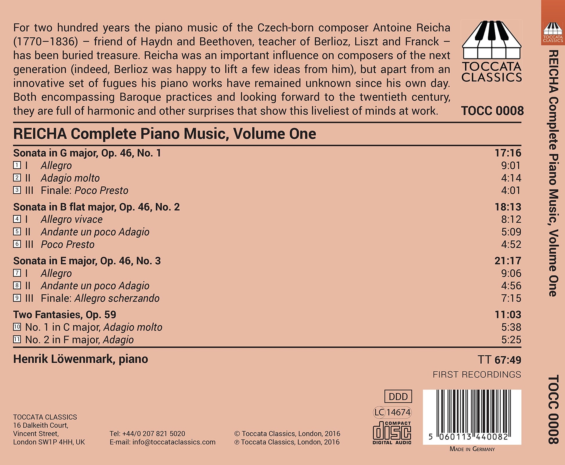 Czech-born composer Antoine Reicha (1770-1836) was an extremely influential influence on composers of the late 19th century. His own compositions, however, fell into obscurity in the shadows of his contemporaries Haydn and Beethoven. This release, compiling Reicha’s complete piano works, displays his usage of both Baroque compositional practices and of compositional practices that would look forward into the twentieth century. An international authority on the piano works of Reicha, Henrik Lowenmark is a Stockholm-based musician who is active as a solo artist, accompanist, and chamber musician.