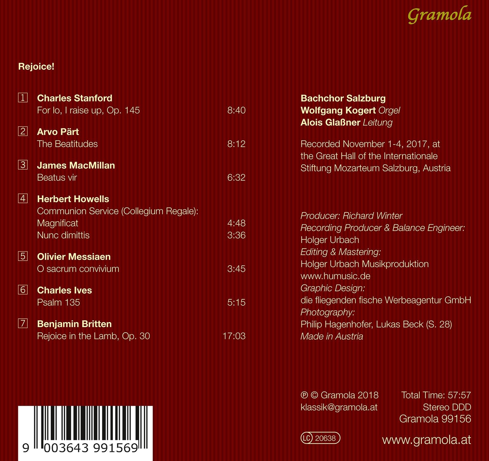 The Bach Choir Salzburg was founded in 1983 and soon came to prominence as one of Austria’s leading vocal ensembles. During the last decade it has additionally acquired an international reputation. Since 2003 its artistic director has been Alois Glaßner. The choir appears regularly at the Salzburg Festival, where it has been acclaimed at numerous concerts as well as in opera productions. The Bach Choir Salzburg has appeared with many outstanding conductors and with orchestras of the eminence of the Vienna Philharmonic, the Mozarteum Orchestra, the Salzburg Camerata, and more. With this release, “Rejoice,” featuring organist Wolfgang Kogert, the Bach Choir presents selected works for choir and organ, including the eponymous ‘Rejoice with the lamb’ Op. 30 by Benjamin Britten, ‘O sacrum convivium’ by Olivier Messiaen, Charles Ives’ ‘Psalm 135,’ and more. The great stylistic diversity of one of the leading Austrian vocal ensembles comes into its own with this release.
