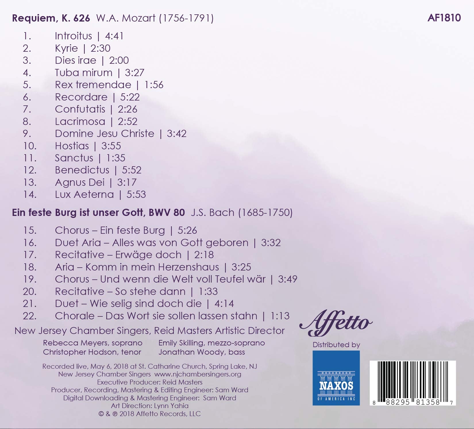 This live recording features the New Jersey Chamber Singers 40th Anniversary concert celebration. The program is anchored by the Mozart Requiem and also features festive works of Bach’s Reformation Cantata, Ein feste Burg, because 2018 also marked the 500th anniversary of the Lutheran Reformation. While it is more common to hear these works performed by larger ensembles, this historically-informed performance honors the repertoire’s intimacy by only employing 32 voices and a similarly sized orchestra. All three pieces on this album were touched by hands beyond those of their composers. While many purists have worked extensively to cleanse iconic works of foreign elements, this performance embraces them. Bach’s Ein feste Burg proudly features the extra parts for three trumpets and timpani added by his son, Wilhelm Friedemann Bach. Haydn’s Te Deum was written for Empress Marie Theresa even though he was employed to write music for the Esterhazy court in Eisenstadt. Even though the complete autograph is lost, trombone parts were later discovered to have been written in the hand of his copyist, Johann Elssler. So, it is probable that Haydn delivered a large-scale work including three trombones and three trumpets to the Empress, even though he performed a slightly down-sized version of the same work in Eisenstadt to accommodate the orchestral forces available to him. This recording boasts all extant parts. Finally and most famously, Mozart’s Requiem was completed by Süssmayr following his death in 1791. This album honors a perspective in which early music is still a living art that is capable of change and worthy of exploration.