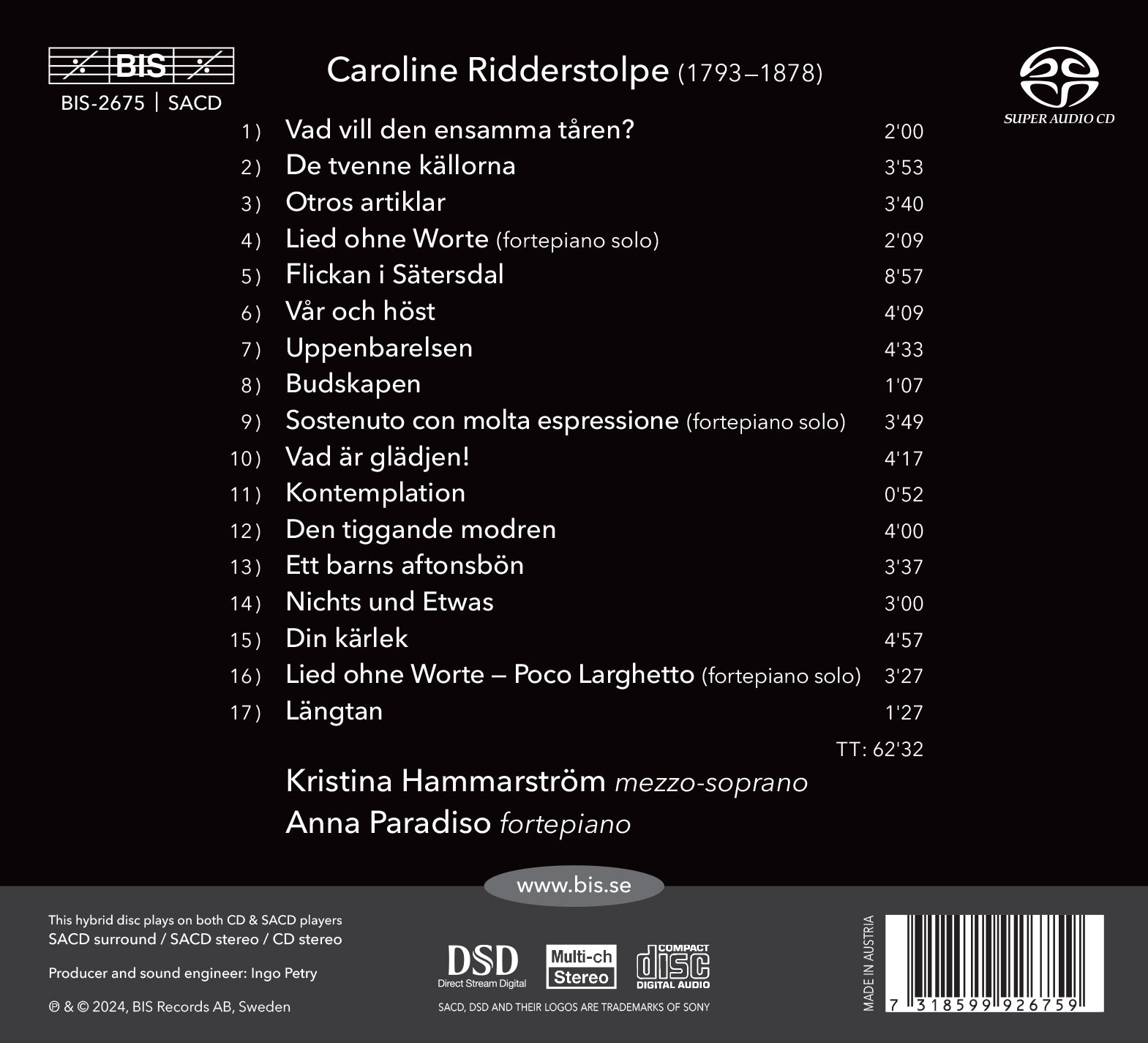 Caroline Ridderstolpe's music remained virtually unknown for almost 200 years, until Anna Paradiso rediscovered it as part of her research into nineteenth-century Swedish salon music. Born in Berlin, Ridderstolpe received an extensive musical education that included singing, instrument-playing and composition. After her marriage to a member of the Swedish aristocracy, she settled in Sweden, participated in the salons held at the royal court and socialised with some of the finest musicians, writers and painters of her time. Ridderstolpe mainly composed songs and pieces for solo piano that belong to the genre of salon music which, far from being mediocre as is sometimes claimed, actually allows greater intimacy with the listeners. Ridderstolpe's songs are often based on poems by Swedish writers and represent a perfect union of text and music. According to Anna Paradiso, Caroline Ridderstolpe's music has a kind of sadness and depth that could be described as 'modern', reminiscent of the lieder of Beethoven, Schubert and the Schumanns. In keeping with the soundscape of Ridderstolpe's era, the music is performed here by Anna Paradiso on an original square piano whose particularity and charm lie not in the evenness of all the notes as one might expect from a modern instrument, but rather in the independent beauty of each string. This instrument is combined with the expressive voice of the eminent mezzo-soprano Kristina Hammarstrom. By giving once more a voice to Caroline Ridderstolpe's music, the performers wish to cast new light on women's power over their own creativity and therefore over their own lives.