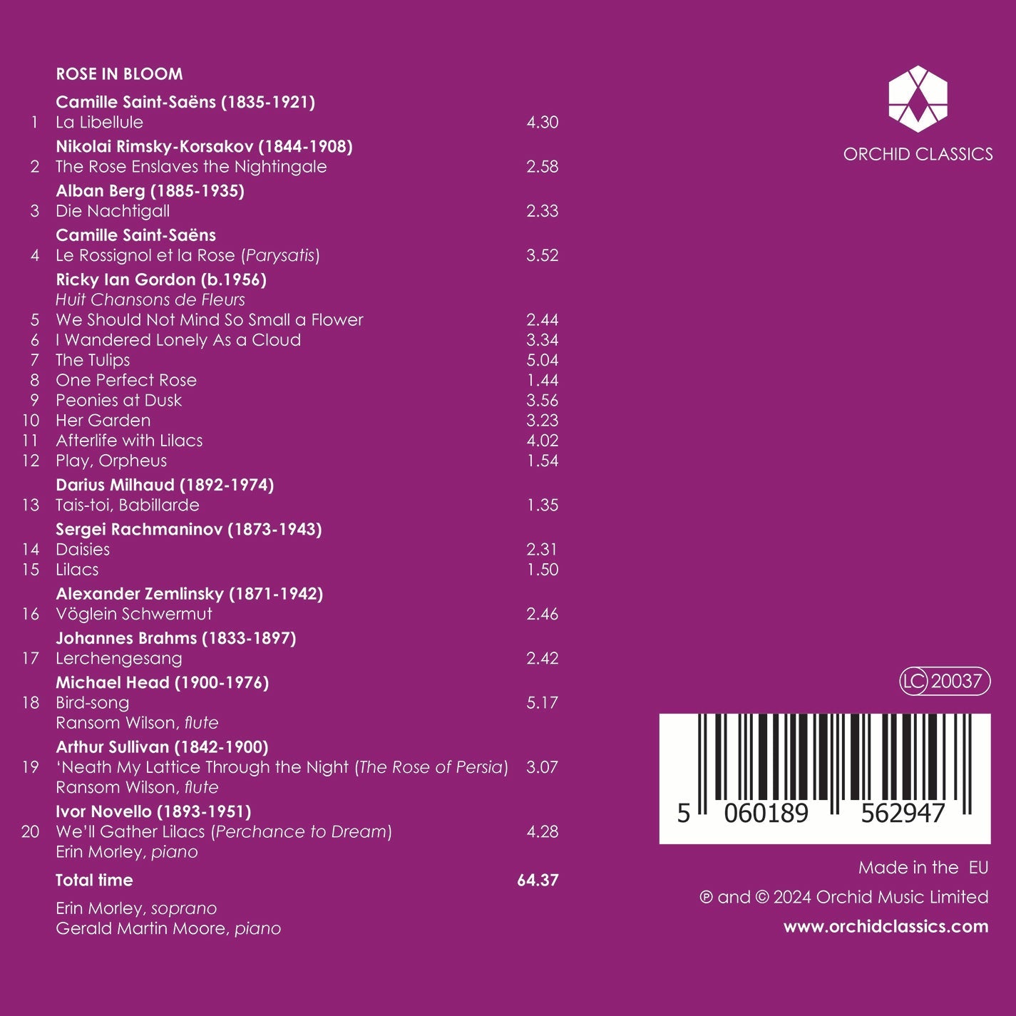 Among the album's highlights is Saint-Saëns's "La Libellule," a rarely heard gem capturing the agile movement of a dragonfly. Sullivan's "Rose-in-Bloom" stands out as the first to present the aria in its original key, the heights of the final cadenza just one example of Morley’s extraordinary performance of the repertoire. The program also includes compositions by Rachmaninov, Zemlinsky, and Milhaud, exploring further connections to the themes of blossoms and birds.