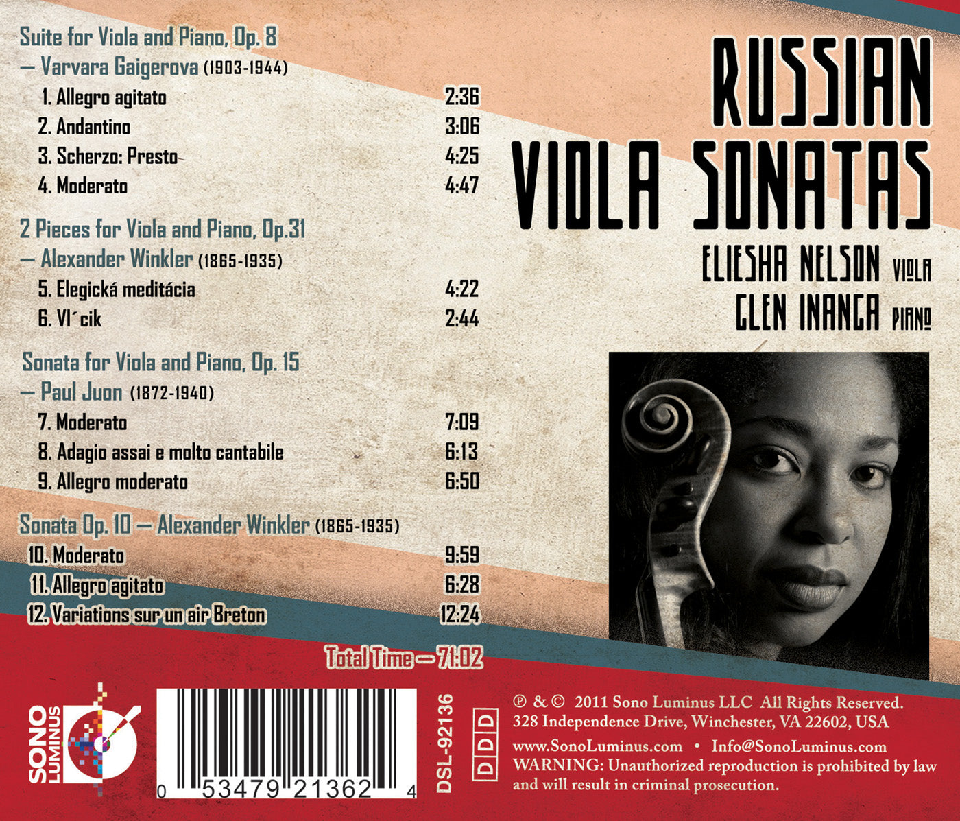 GAIGEROVA Suite for Viola and Piano. WINKLER 2 Pieces, op. 31. Viola Sonata in c. JUON Viola Sonata in D • Eliesha Nelson (va); Glen Inanga (pn) • SONO LUMINUS DSL-92136 (71:02)