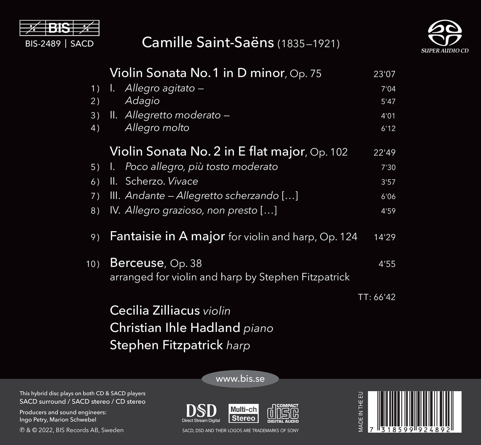 Saint-Saëns's chamber music broke new ground in France at a time when public taste tended to favour opera and opéra-comique. His first Sonata for violin and piano, one of the earliest composed in France, is a masterpiece of boundless beauty. Its emotional impact and its highly poetic content are served by the composer’s perfect mastery of formal architecture. It has also been proposed as the model for the ‘Vinteuil Sonata’ which runs through Marcel Proust's novel cycle ‘In Search of Lost Time’. The second Sonata, composed in Egypt, is very different from its predecessor: more serious, classical, and intimate. While the writing is more melodic, the composer prophesied that the sonata would not be understood “until the eighth hearing”. These two masterpieces are complemented by the Fantaisie for violin and harp, a virtuoso work in which the use of the harp rather than the piano produced a delicate, refined, even magical sound reminiscent at times of Fauré and Debussy, and by the charming Berceuse, one of Saint-Saëns’ best-known miniatures. Originally for violin and piano, it is performed here in an arrangement for violin and harp that, again, emphasizes the subtleties of Saint-Saëns’ writing.