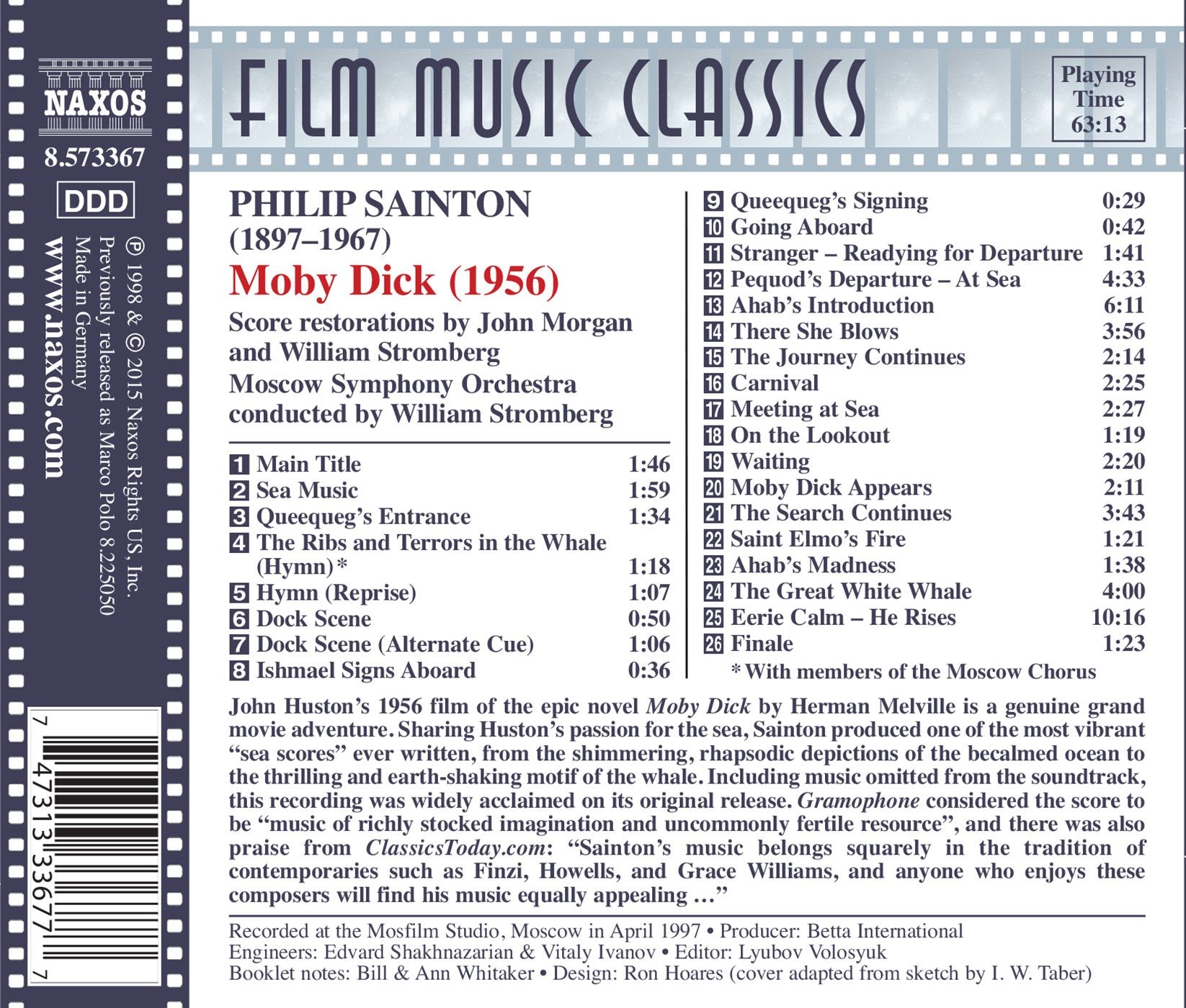 John Huston’s 1956 film adaptation of Melville’s epic novel Moby Dick is a genuine grand movie adventure. For it, Phillip Sainton (1897-1967) produced one of the most vibrant “sea scores” ever written, from the shimmering, rhapsodic depictions of the becalmed ocean to the thrilling, earth-shaking whale motif. Including music omitted from the soundtrack, this recording was widely acclaimed upon its original release, with Gramophone considering the score to be “music of richly stocked imagination…” “… anyone who enjoys Finzi and Howells will find Sainton’s music equally appealing …” (ClassicsToday)