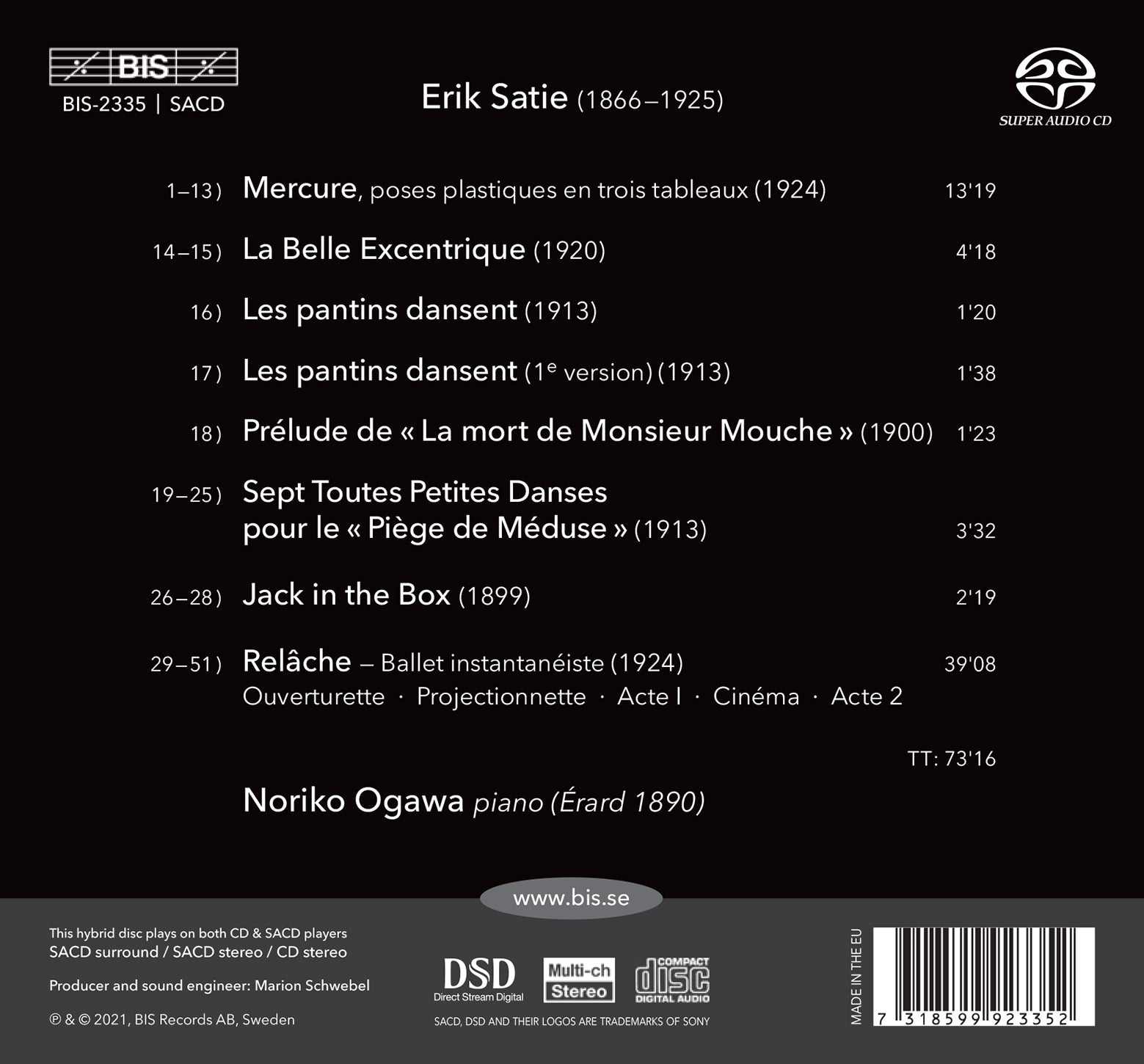 For the fourth installment in her acclaimed Satie cycle, Noriko Ogawa has gathered music written for the stage – from the pantomime Jack in the Box (1899) to the ballet Relâche (1924) – one of Satie’s last works. Several of the pieces exist in different scorings, but the piano versions heard here are all Satie’s own. Throughout the program, what comes across strongly is the influence of music hall and cabaret.