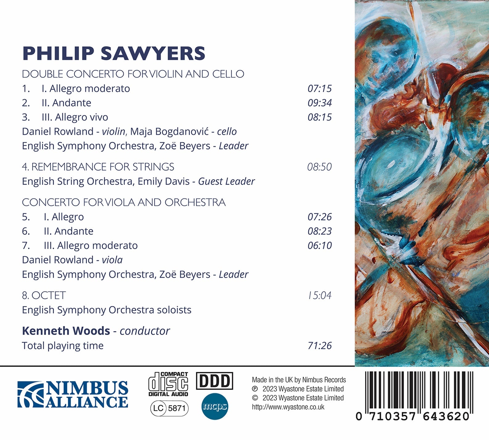 The viola concerto was written in 2020. The idea came after attending the recording sessions and performances of a double concerto for violin, viola and string orchestra by my fellow composer and friend David Matthews. The lovely playing of the viola part by Sarah-Jane Bradley set off some ideas for a viola concerto of my own. In 2007 the mixed chamber music ensemble ‘Liquid Architecture’ commissioned me to write them an octet for their appearance at the Chelsea Schubert Festival. The Schubert Octet was on their programme so the instrumentation was pre-determined: clarinet, horn, bassoon, 2 violins, viola, cello and double bass. The piece is in one continuous movement in four sections: Adagio, Allegro, Andante and Allegro. This is the 6th title available in the Philip Sawyers series available on Nimbus Alliance.
