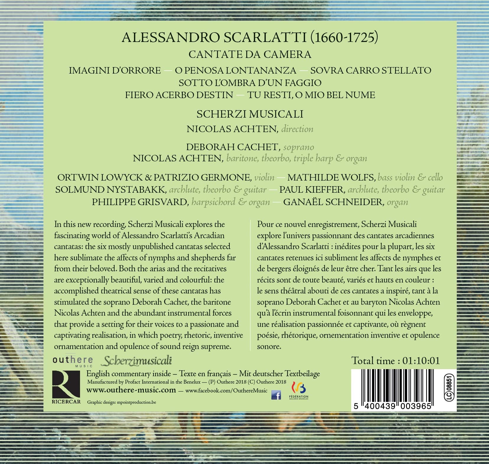 In this new recording, Scherzi Musicali explores the fascinating world of Alessandro Scarlatti’s Arcadian cantatas: the six mostly unpublished cantatas selected here sublimate the affects of nymphs and shepherds far from their beloved. Both the arias and the recitatives are exceptionally beautiful, varied and colorful: the accomplished theatrical sense of these cantatas has stimulated the soprano Deborah Cachet, the baritone Nicolas Achten and the abundant instrumental forces that provide a setting for their voices to a passionate and captivating realization, in which poetry, rhetoric, inventive ornamentation and opulence of sound reign supreme. In about 10 years, Scherzi Musicali has become one of the brightest stars in the early music cosmos, and is renowned for its dynamic interpretations of seventeenth and eighteenth century repertoire which its musicians explore with insatiable appetite and zeal. Whether uncovering lost gems of a forgotten musical heritage or revisiting staples of the baroque repertoire, the musicians of Scherzi Musicali apply the same exacting approach to all of the works they interpret, using philological research and reflection to guide them in their never-ending quest for the most accurate and historical performance style.