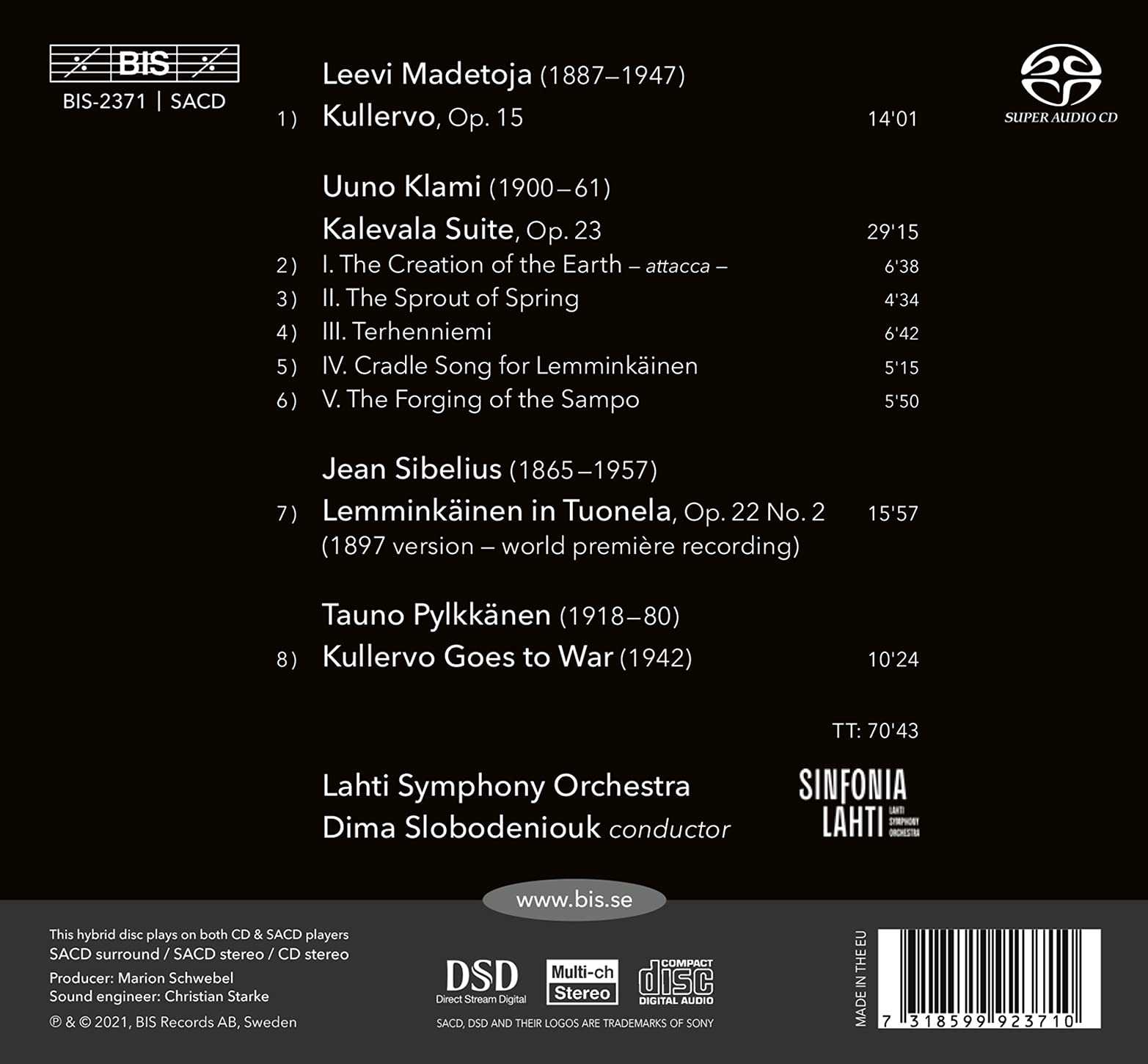 The Kalevala is a compilation of mostly original folk poetry, arranged into fifty extensive runos (‘poems’) by the Finnish physician and folklorist Elias Lönnrot. Beginning with the creation of the world, it develops into a series of separate episodes which nevertheless form a rich whole, introducing epic characters such as Väinämöinen, Lemminkäinen and Kullervo. The collection first appeared in 1835, with a final, extended version being published in 1849, and was soon hailed as Finland’s ‘national epos’ – a sensitive matter given that the country had been subjected to Russian rule since 1809. It came to play a major part in Finland’s national awakening and had a massive influence on Finnish art in the late 19th century, but its role in the national consciousness remains important even today. The present album, from the Lahti Symphony Orchestra and Dima Slobodeniouk, brings together Kalevala-related works spanning the period between 1897 and 1943. No such collection could overlook Sibelius, who composed several works inspired by the epos. Included here is a rarity – the first recording of the 1897 version of Lemminkäinen in Tuonela, from the Lemminkäinen Suite. Finnish composers from later generations all had to find a way out from under Sibelius’s shadow – especially so when composing works based on the Kalevala. The portraits of Kullervo which bookend the disc, by Leevi Madetoja and Tauno Pylkkänen, are both compact works in contrast to Sibelius’s large-scale ‘choral symphony’ on the same theme, and when Uuno Klami used bold and primitive colors in his five-movement Kalevala Suite, he was looking towards Stravinsky rather than his countryman.