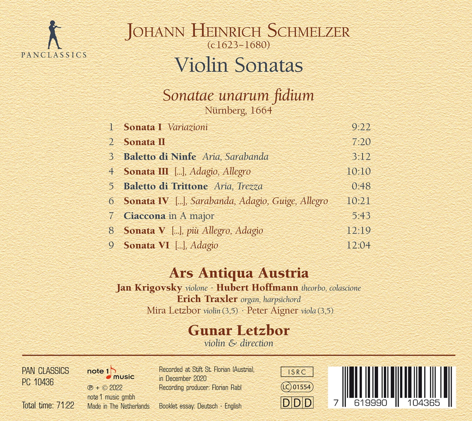 Johann Heinrich Schmelzer is considered the founder of the Austrian violin school. He led violin music in Austria and in Europe to its first peak and influenced many of his younger violinist colleagues. He started his professional career as a violinist and cornett player at the Imperial Court Chapel in Vienna. There, his compositional skills were noticed, and he was appointed Vice-Kapellmeister and finally Court Kapellmeister with a title of nobility by the Emperor. His collection "Sonatae unarum fidium" (Sonatas for one violin), printed in Nuremberg in 1664, established his reputation as an outstanding violinist throughout Europe. In these six sonatas for violin and basso continuo he breaks all the boundaries of what had been technically possible on the violin up to that time. Schmelzer enriches the bowing technique by inventing new types of strokes, and he takes the left hand to the highest positions of the fingerboard of the time. Through daring harmonic turns in the development of the cycle, he achieves profound musical expression and heart-wrenching atmospheric images, which Gunar Letzbor stages with feeling and technical maturity.