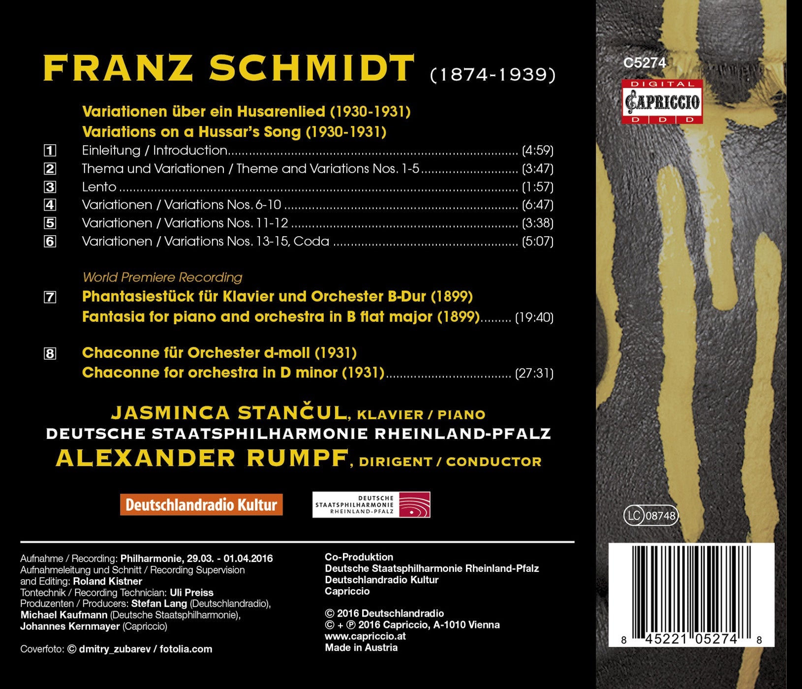 When one thinks of the compositions of Franz Schmidt, his organ pieces and his oratorio The Book with Seven Seals automatically come to mind. This recording, however, explores some of Schmidt’s lesser-known works. A notable addition to this album is the Fantasia for piano and orchestra in B flat major, in which the listener can hear material from his future successful opera Notre Dame. The work was considered lost for some time, with the work’s premiere coming a century after its composition. This is the piece’s world premiere recording. Performing on the Fantasia is pianist Jasminka Stancul. Stancul performs worldwide with orchestras and as a soloist, and has been a professor at the Music University Ljubljana since October 2013.