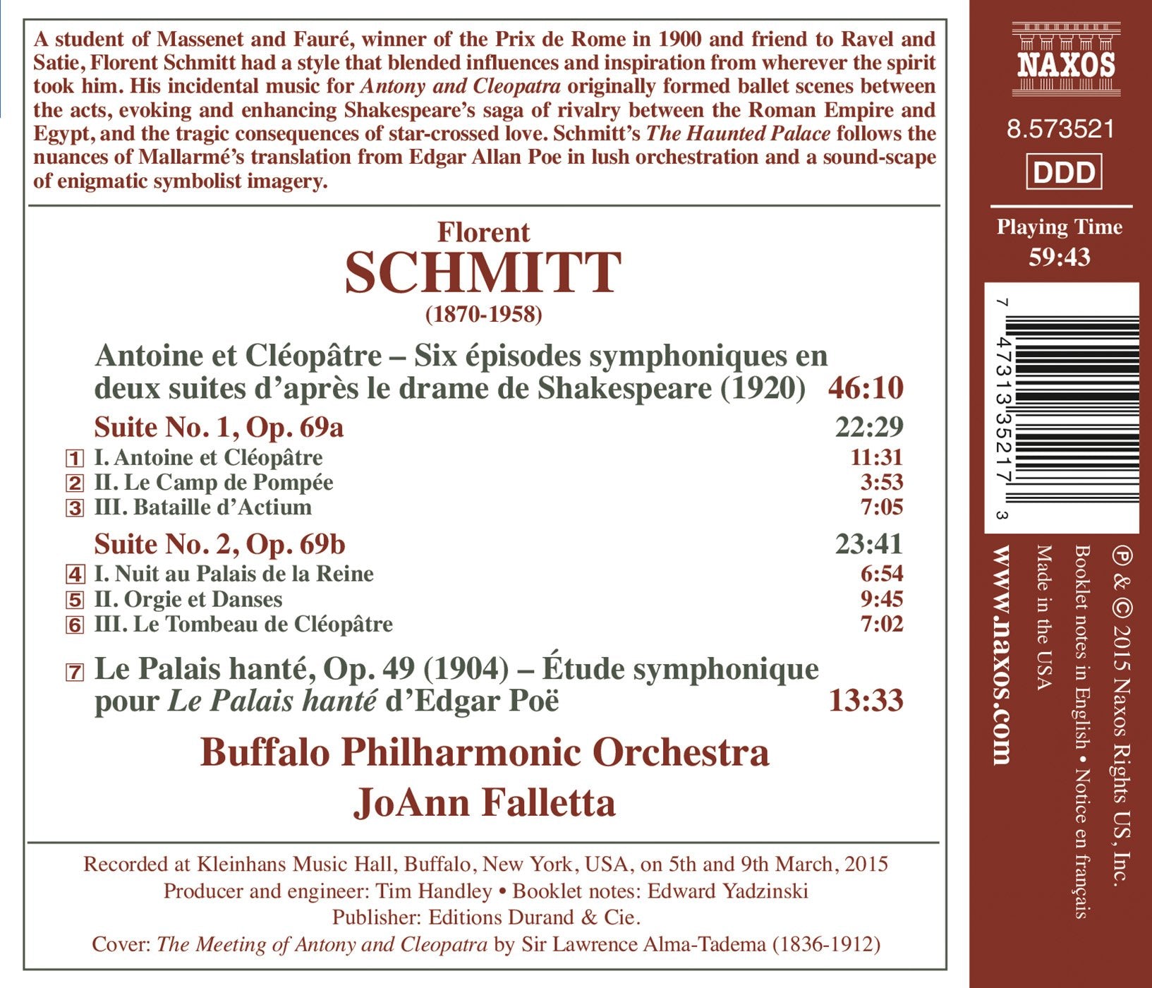Florent Schmitt life spanned both the late Romantic and 20th century eras and he counted Erik Satie and Maurice Ravel among his close friends. For most of his career he worked as a music critic and early on perceptively predicted the influence jazz would have on the future of serious music. His compositional output was comprised of a mish-mash potpourri of styles which included scores for theatre, including ballet and stage plays, including this collection of incidental music for Shakespeare’s Antony and Cleopatra featuring the Buffalo Philharmonic conducted by JoAnn Falletta.