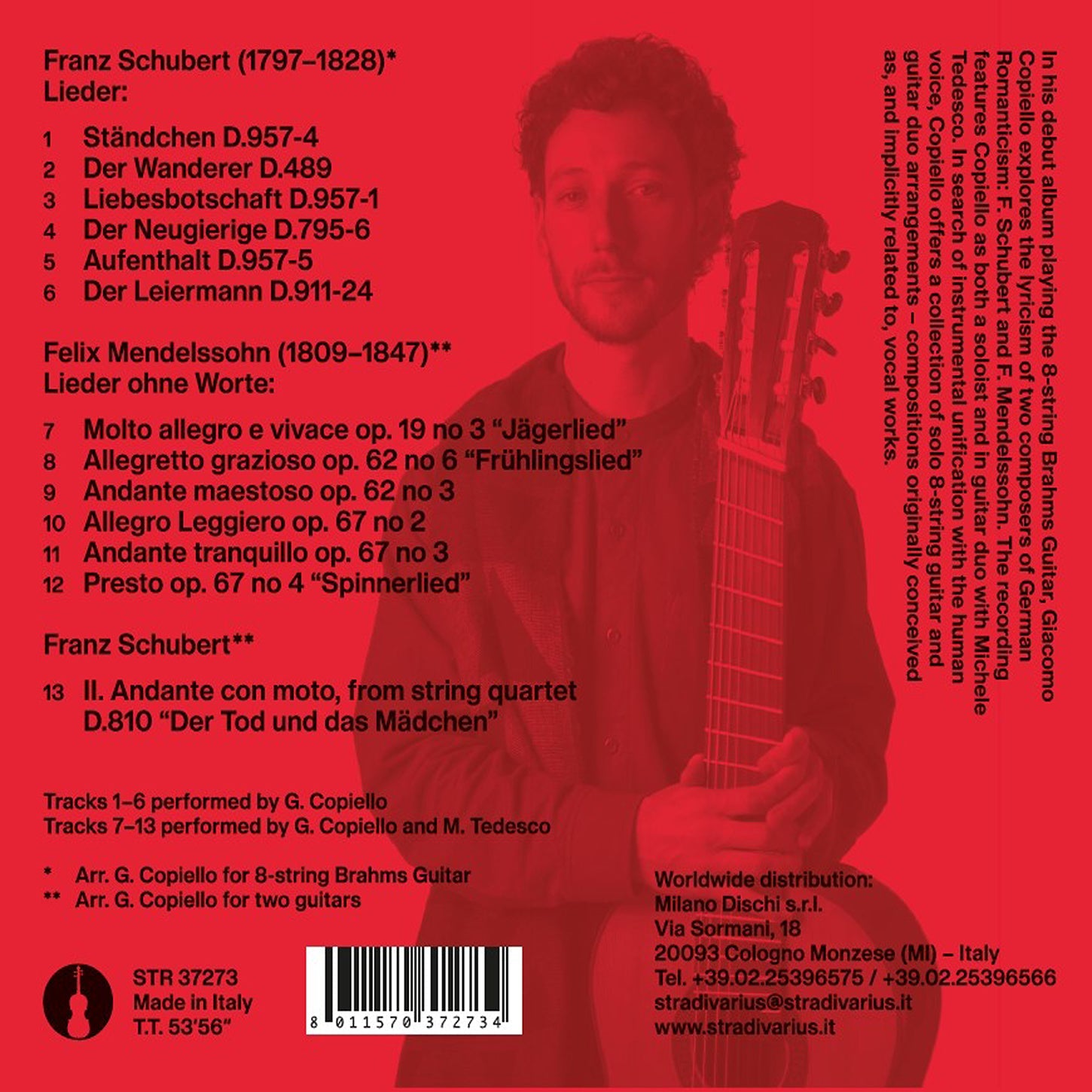 It is indeed a pleasure to find myself writing the introduction to this record programme, the result of an extended gestation spanning more than a decade of my musical research. The common thread of this project is the search for a personal reflection in the mirror of the anthropomorphic musical instrument par excellence, the human voice. Finding a parallelism between vocal cords and guitar strings, by arranging originally vocal works. This primordial and initiatory sound in the communication between living beings is here understood as a medium that goes under the musical epidermis, towards a more anthropologically horizontal pulsation and resonance. Over the centuries, from the Gregorian chant onwards, we have witnessed a fervent “musically oriented” approach to sound and metrics, in favour of instrumental performance and dance. However, in my experience, the most effective musical expressions have always been characterised by a communicativeness that goes beyond the instrument, revealing an expressive flow that, unmediated, takes us back to the apparent naturalness of the vocal expression. Similarly, from the opposite perspective, it was enlightening for me to listen to Carmelo Bene’s recordings and discover that Valerio Binasco studied The Tempest using the metronome, to get in contact with “the musicality of speech”. The intention to interbreed with the human voice has been and still is for me an inexhaustible source of inspiration. This research, which can be extended to compositions of all epochs, is presented here in a compact version, through the arrangement of works by two authors belonging to German Romanticism.