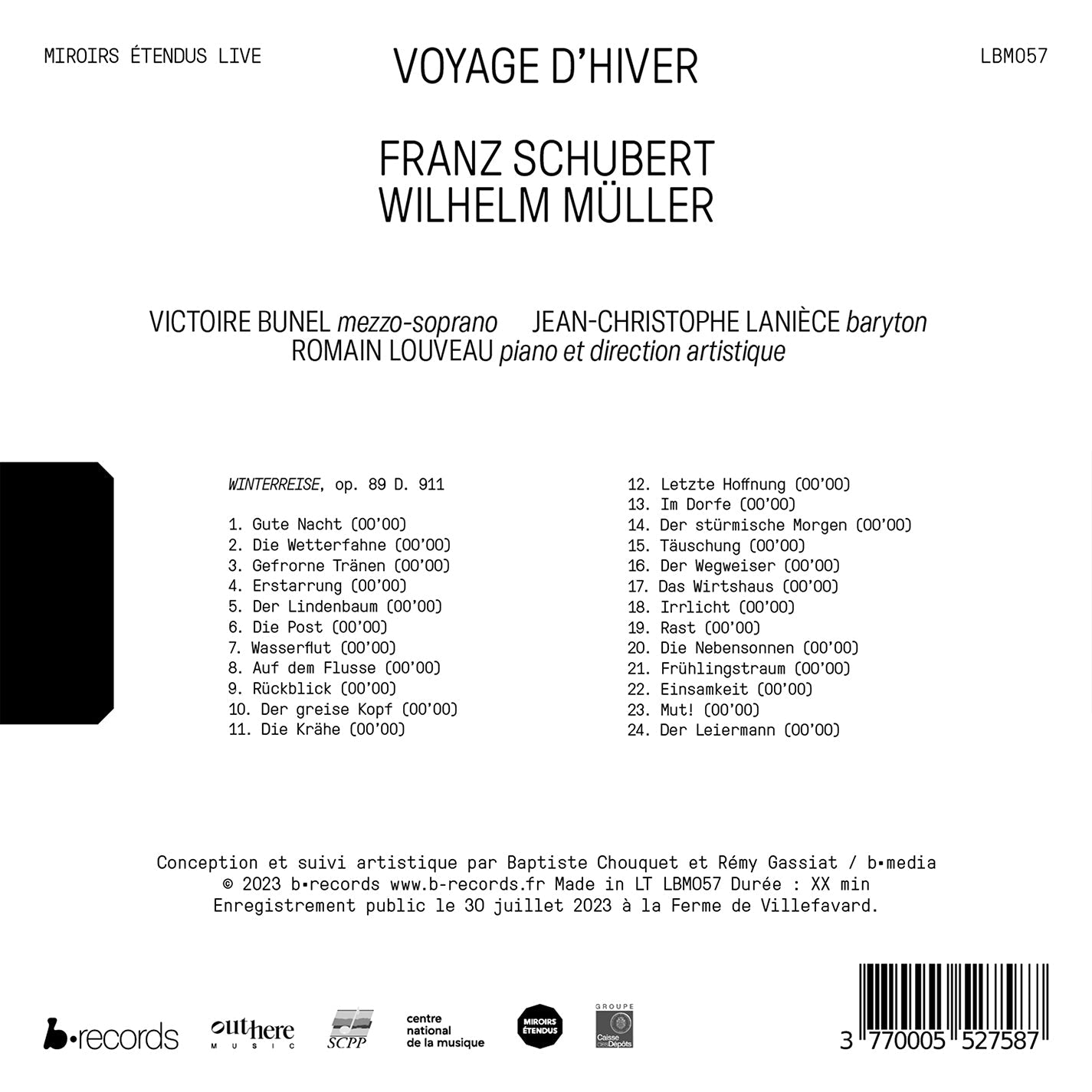 With this new B Records disc, the Miroirs Étendus company revisits one of the greatest classics of the Lieder repertoire, questioning the interpretative heritage that has long been associated with it. Pianist and artistic director Romain Louveau, baritone Jean-Christophe Lanièce and soprano Victoire Bunel propose a multi-voiced Winterreise that disembodies the overused figure of the Wanderer and favors the autonomy of Wilhelm Müller's poems. Like the Schubertian motifs that seem to appear of their own accord, only to eclipse themselves, the musicians venture a depersonalized interpretation that places the figure of the stranger at the center of this lyrical spectacle.