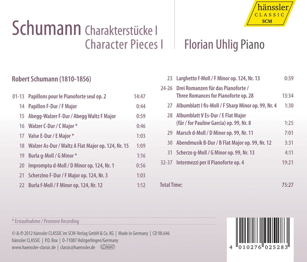 Hänssler Classic is proud to release the fourth volume in what will be the only true complete recording of Schumann's music for piano solo. On the 4th volume ("Schumann in Vienna"), Florian Uhlig presents piano works composed in Vienna in 1838/39, amongst others "Faschingsschwank aus Wien op.26" and "Humoreske B Flat Major op.20".