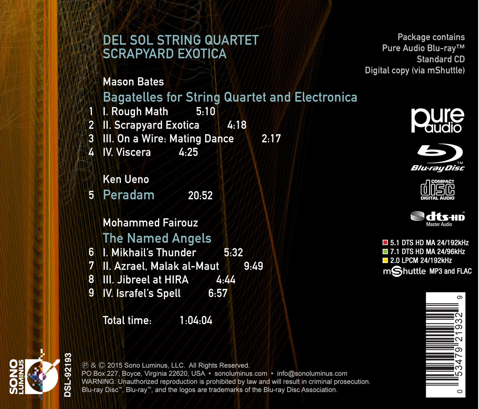 Scrapyard Exotica, Del Sol String Quartet’s third full Sono Luminus studio album, features a triumvirate of composers representing leading voices in very different flavors of music within the classical avant-garde. A wide-ranging diversity of influences feeds each composer’s unique voice, firmly rooted in the here and now, sharing their experiences of life in the 21st c. Mason Bates’ four exciting “Bagatelles for String Quartet and Electronica” was made in collaboration with Del Sol by playing with new sounds in the studio. “Peradam” by Ken Ueno utilizes throat singing. Mohammed Fairouz’s meditative four movements piece “The Named Angels”, refers to those angels named and recognized in the Islamic, Christian and Jewish traditions: Michael, Israfel, Gabriel and Azrael. Hailed by Gramophone as “masters of all musical things they survey,” The San Francisco based Del Sol String Quartet, two-time winner of the top Chamber Music America/ASCAP Award for Adventurous Programming, commissions and performs outstanding new works from around the world. They have released seven prior CDs since 2002, including their first Sono Luminus release ZIA (DSL-92164) and the widely acclaimed Sculthorpe: The Complete String Quartets with Didjeridu (DSL-92181).