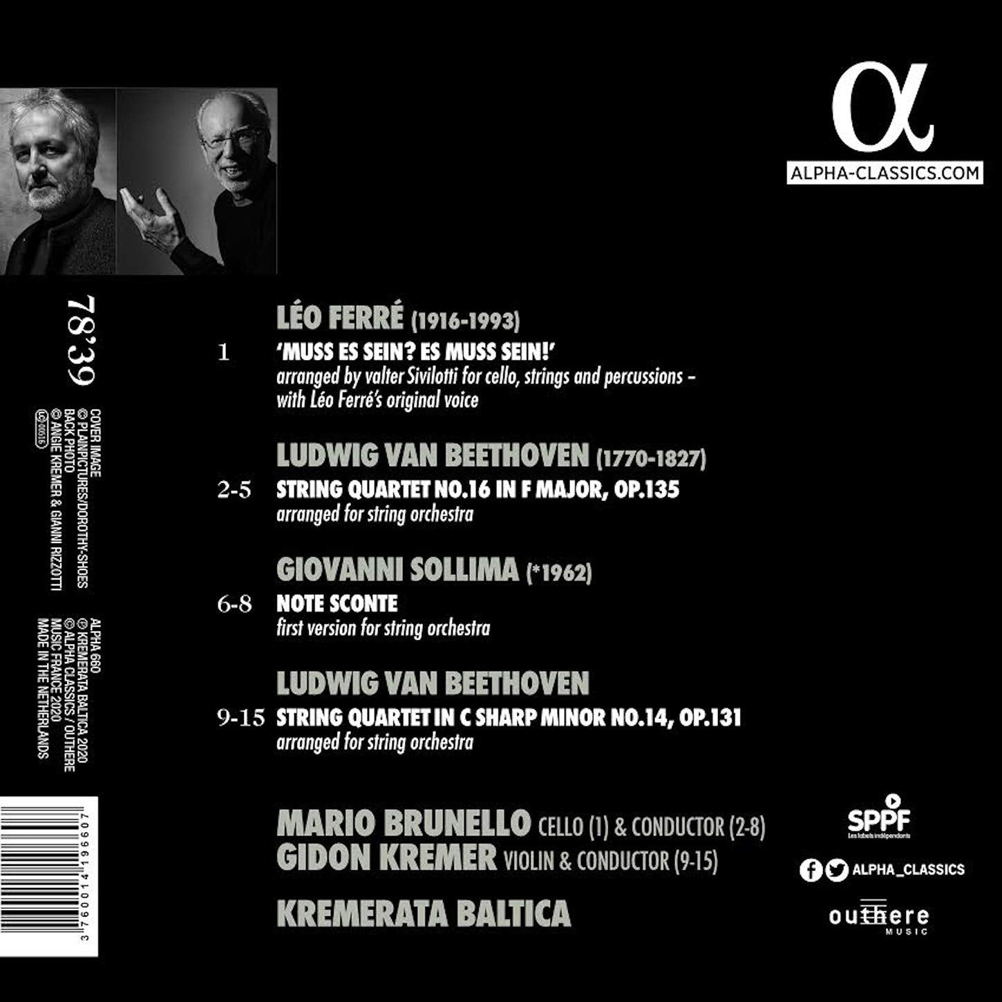 Gidon Kremer and Mario Brunello pay tribute to Beethoven by presenting two of his most famous quartets in a version for string orchestra played by Kremerata Baltica. The ensemble’s founder Gidon Kremer directs op.131 from the violin, while Mario Brunello conducts op. 135 and adds two contemporary pieces, one by Leo Ferre, ‘the revolutionary, anarchic, inspired singer-songwriter and great lover of Beethoven’: Muss es sein? Es muss sein! ‘We perform this hymn to ‘free music’ in a version arranged by Valter Sivilotti for cello, strings and percussion with Ferre’s original voice… Note sconte means ‘hidden notes’ in Venetian dialect. Franco Rossi, the legendary cellist of the Quartetto italiano, always invited his students, including me, to look for and give importance to the note sconte in the scores of string quartets. I asked Giovanni Sollima to write a piece in memory of Franco Rossi, of his great passion for Beethoven and his note sconte,’ comments Mario Brunello. ‘These two works form a bridge between Beethoven and our times, giving the expression “Searching for Ludwig” a concrete reality in sound,’ concludes Gidon Kremer.