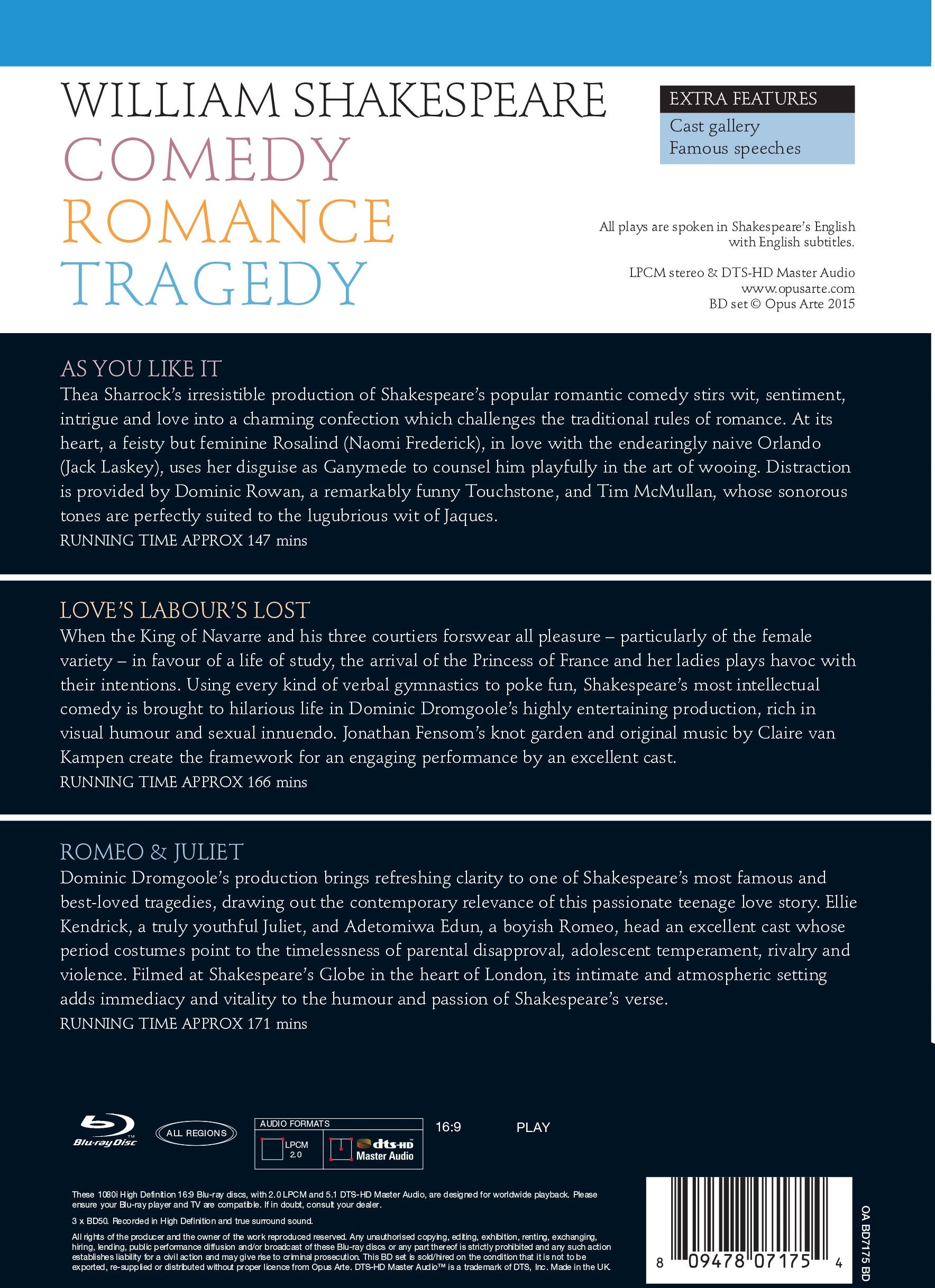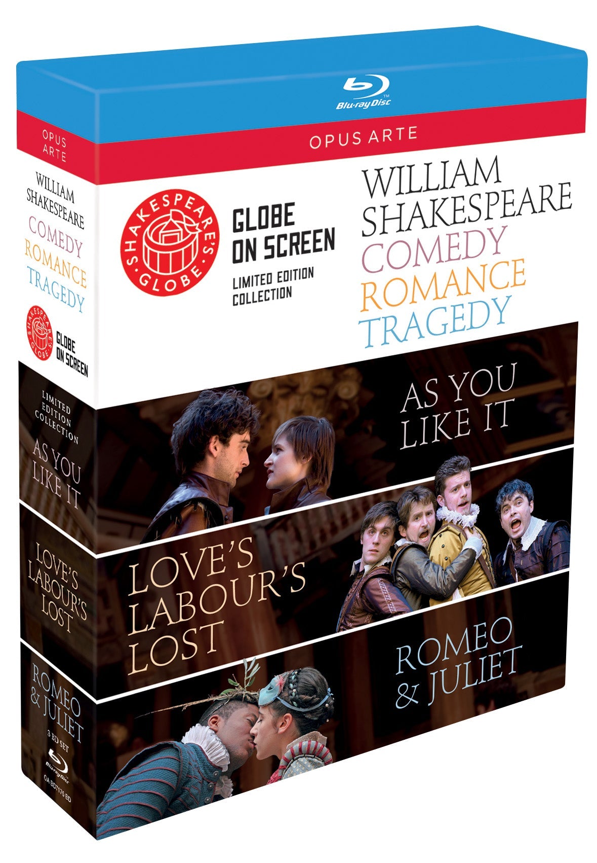 The Globe Theatre’s productions of William Shakespeare's As You Like It, Love's Labour's Lost and Romeo & Juliet are now available in this exclusive limited edition blu-ray box set from Opus Arte.Thea Sharrock’s production of As You Like It Shakespeare’s popular romantic comedy, stirs wit, sentiment, intrigue and love into a charming confection challenging the traditional rules of romance.In Love’s Labour Lost, the bard’s most intellectual comedy, the King of Navarre and his three courtiers forswear all pleasure – particularly of the female variety – in favor of a life of study, but the arrival of the Princess of France and her ladies plays havoc with their intentions.Dominic Dromgoole’s production of Romeo & Juliet brings refreshing clarity to one of Shakespeare’s best-loved tragedies, drawing out the contemporary relevance of this passionate teenage love story.