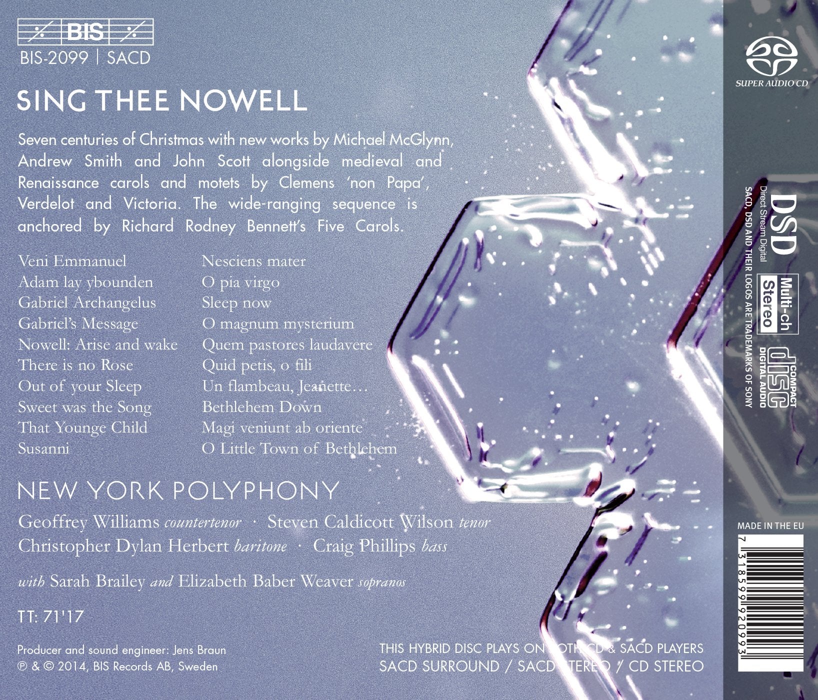 This new Christmas recording from the male vocal quartet New York Polyphony treads a traditional path–organizing the program sequentially according to the Christian church calendar (from Advent through Epiphany) and primarily sticking to works with familiar texts and sometimes tunes–but from the outset gives notice that the musical settings will not necessarily be the ones you know–which can be a very good thing, or not quite so much. The familiar chant melody of the Advent hymn Veni Emmanuel opens the disc, the four voices in perfect unison–until an unexpected, biting dissonance on the words “Gaude! Gaude!”, repeated in each verse. While in the rest of the piece composer Andrew Smith couches the basic chant melody in a pleasing framework of combined modern and ancient harmonic ideas, this recurring, deliberately ear-grating sound (especially so with these singers’ superbly-tuned, super-vibrant voices!) seems forced and, unless there’s some kind of intended irony–a bitter call to “Rejoice!” for the coming of the Son of God?–this use of extreme dissonance just doesn’t make sense. As always with these things, others will disagree–and no one can deny either the singers’ individual vocal beauty or the impressive ensemble polish.