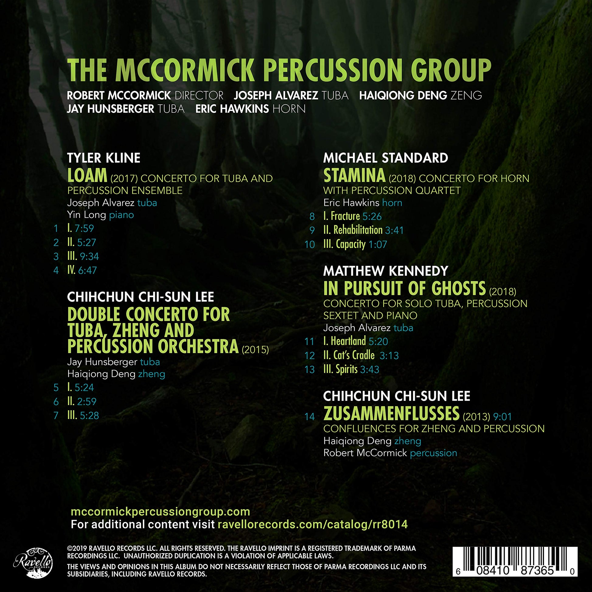 Soli for Tuba, Zheng, Horn with Percussion is percussionist Robert McCormick’s tenth album with PARMA Recordings. On their latest album, the Robert McCormick Percussion Group performs five compositions from four distinct composers, each of whom contributes striking works that range from personal to global inspiration. The album opens with Loam, a concerto for tuba and percussion ensemble composed by Tyler Kline. Much of the concerto is texture-based in order to convey the idea of loam, or soil, with some parts of the music reflecting the sound of the earth being tilled. The general arc of the concerto is cyclical, a metaphor for being born from the earth and returning to the earth after death. Chihchun Chi-sun Lee’s Double Concerto for Tuba, Zheng and Percussion Orchestra is a unique amalgam featuring zheng, tuba, and percussion. The first movement creates a unifying sense of color, timbre, and gesture. Movement II mainly focuses on the tuba and zheng, while Movement III displays the sound of the tuba, zheng, and percussion in perfect balance. Written by Michael Standard, Stamina for percussion quartet and horn soloist is comprised of three parts: “Fracture,” “Rehabilitation,” and “Capacity.” “Fracture” sees a breaking apart in every element of the music. “Rehabilitation” strings together the previously fractured pitch material in a new way using glissandos. The final stage, “Capacity,” uses this new pitch organization to fill the spaces with notes. Following this piece, composer Matthew Kennedy and his In Pursuit of Ghosts explores the journey from one chapter of life to the next through the structure of the three-part concerto. Soli for Tuba, Zheng, Horn with Percussion closes with Zusammenflusses (Confluences), another work by Lee, that captures the differences and similarities of the zheng with the vibraphone and cymbal. Zusammenflusses aptly concludes this new addition to the McCormick Percussion Group’s oeuvre, and the album as a whole inspires listeners to explore new and unexpected combinations of sounds to create innovative music.