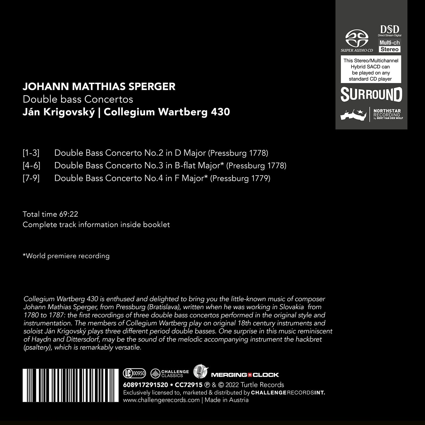 Three concertos for double bass and orchestra by Johann Matthias Sperger, who was not just a composer but also the most renowned double bassist of the 18th century, performed and recorded here by orchestra and soloist according to their original scores. These works are all products of the years of Sperger’s first employment as a double bassist, between 1777 and 1783, in the court orchestra of the archbishop of Hungary, the duke Joseph Graf von Batthyány in Pressburg. They date specifically from the years 1778 and 1779. The soloist uses gut strings, as was common practice at the time of the works’ composition well over two hundred years ago, bringing out the warm sound of the instruments. To do justice to history and for the pleasure of today’s audience the present recordings were made in the same auditorium where Johann Matthias Sperger first presented these concertos: the “Hall of Mirrors” in the Primate’s Palace of Bratislava (formerly Pressburg).