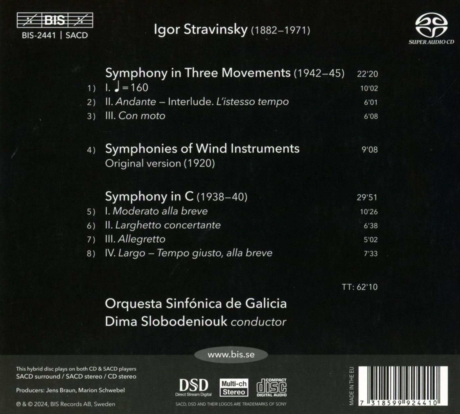 Igor Stravinsky is not a composer who is usually associated with symphonic form. Five of his compositions bear that name, however, even though they have little in common. The first major work Stravinsky composed entirely in the United States, the Symphony in Three Movements seems to pick up where the Rite of Spring left off with it's rhythmic ostinatos and shock effects. It can be interpreted as the composer's response to the Second World War, which was ravaging Europe at the time of it's composition, and it's striking and triumphant conclusion appears to echo of what the composer must have felt. The Symphonies of Wind Instruments, a short, compact work, was a tribute to Stravinsky's friend and colleague Claude Debussy. Although it's kaleidoscopic formal conception disconcerted audiences at it's premiere, it is now considered to be one of Stravinsky's finest works, showing daring originality. The Symphony in C was composed on two continents during a difficult period for the composer, though this is in no way betyrayed by it's simplicity, good humour and 'classicism'. With this disc, the Orquesta Sinfonica de Galicia and Dima Slobodeniouk present a fascinating aspect of the multifaceted output of a composer whose style was constantly evolving.
