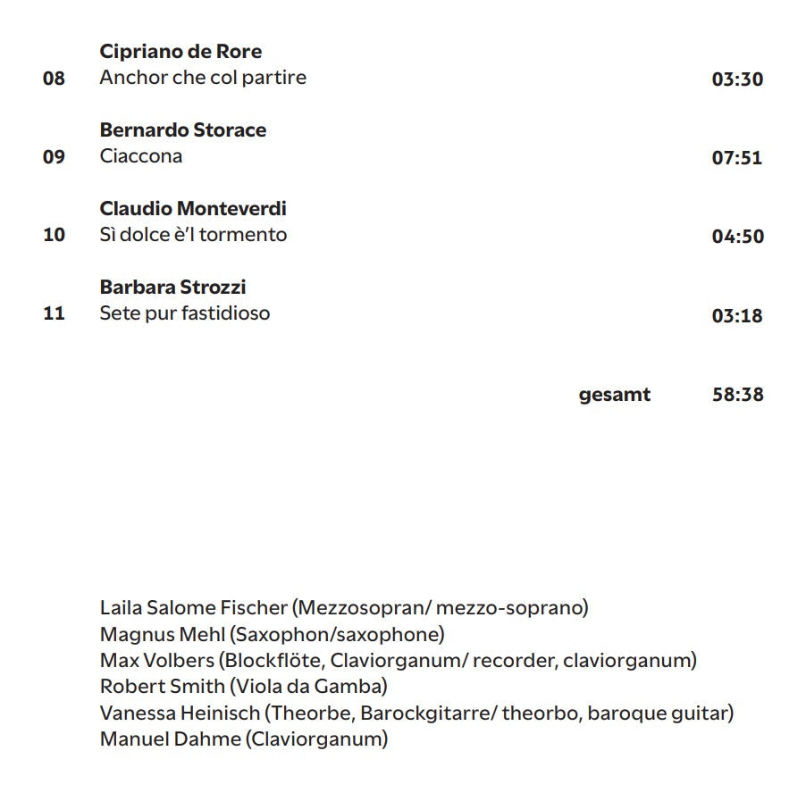 Venice 1600 – The age that witnessed the birth of opera as we know it today also saw the emergence of a liberal, secular musical culture. The polyphonic rigor of earlier times gave way to expressive solo voices and breathtakingly virtuoso instrumental music. Composers were able to have a career outside the restrictions of the church. Young musicians, painters and Bohemians took the salons of the rich elites by storm. Barbara Strozzi, composer as well as acclaimed singer, became one of the leading voices of her generation. A true child of Venice, the lagoon city became a supportive home for her art. Her works reflect the adventurous spirit of a musical world moving towards a new era. In their musical journey, mezzo-soprano Laila Salome Fischer and jazz saxophonist Magnus Mehl revive the Venice 1600 Zeitgeist of awakening and discovery. Backed by the exciting baroque ensemble Il Giratempo, Magnus Mehl translates the ancient tunes and rhythms into his very own musical language.