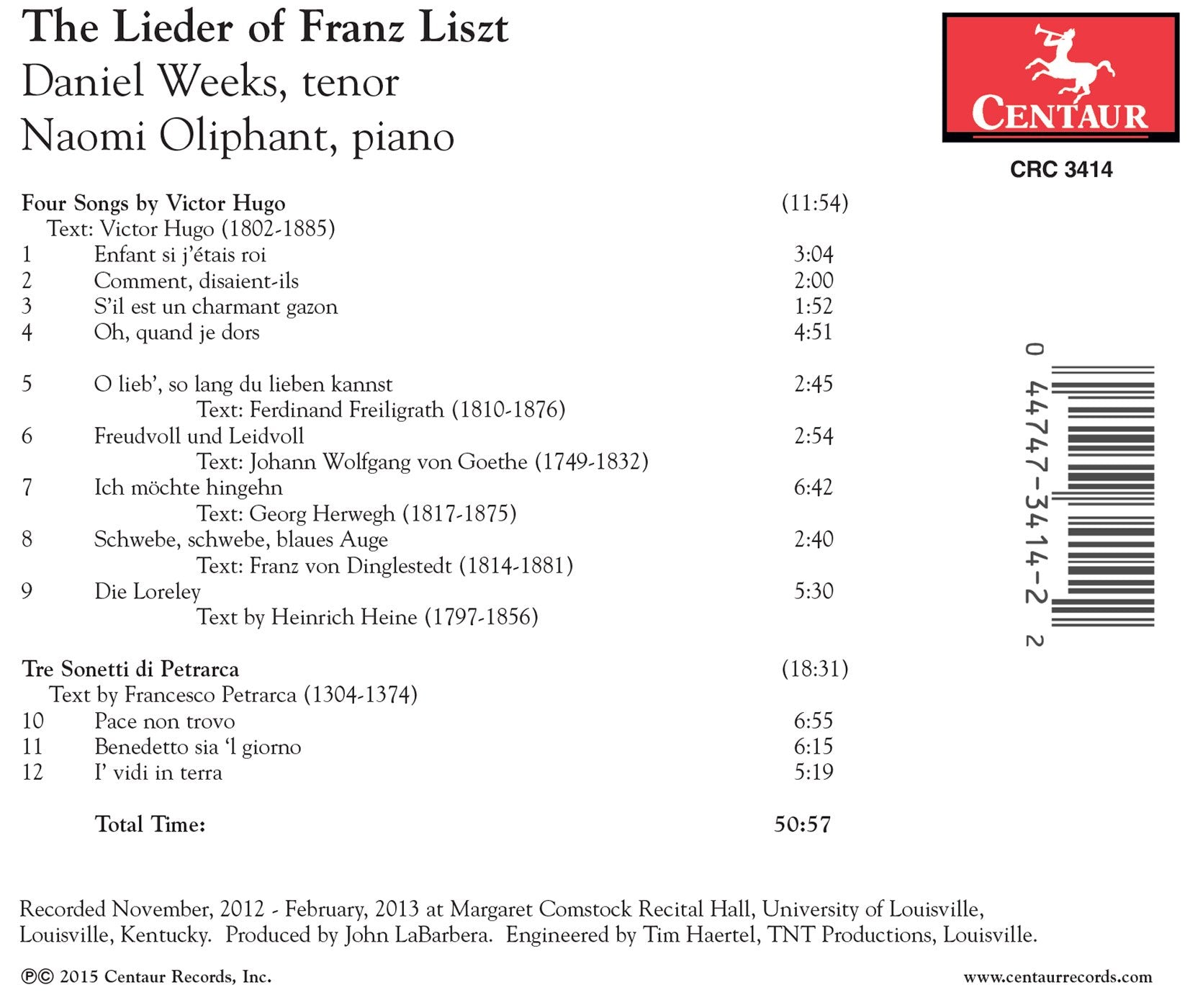 Hungarian composer and virtuoso Franz Liszt gained renown across Europe in the early 19th century for his unmatched piano skills. By 1940 he was considered by many critics to be the greatest pianist of all time.; Liszt was also a diverse composer, and made many contributions to the musical world, most notably the invention of the symphonic poem. He was also one of the most significant representatives of the New German School.; The lieder of Franz Liszt are some of his most beloved works. On this recording, American tenor Daniel Weeks performs these compositions with magnificent insight. Pianist Naomi Oliphant beautifully accompanies.