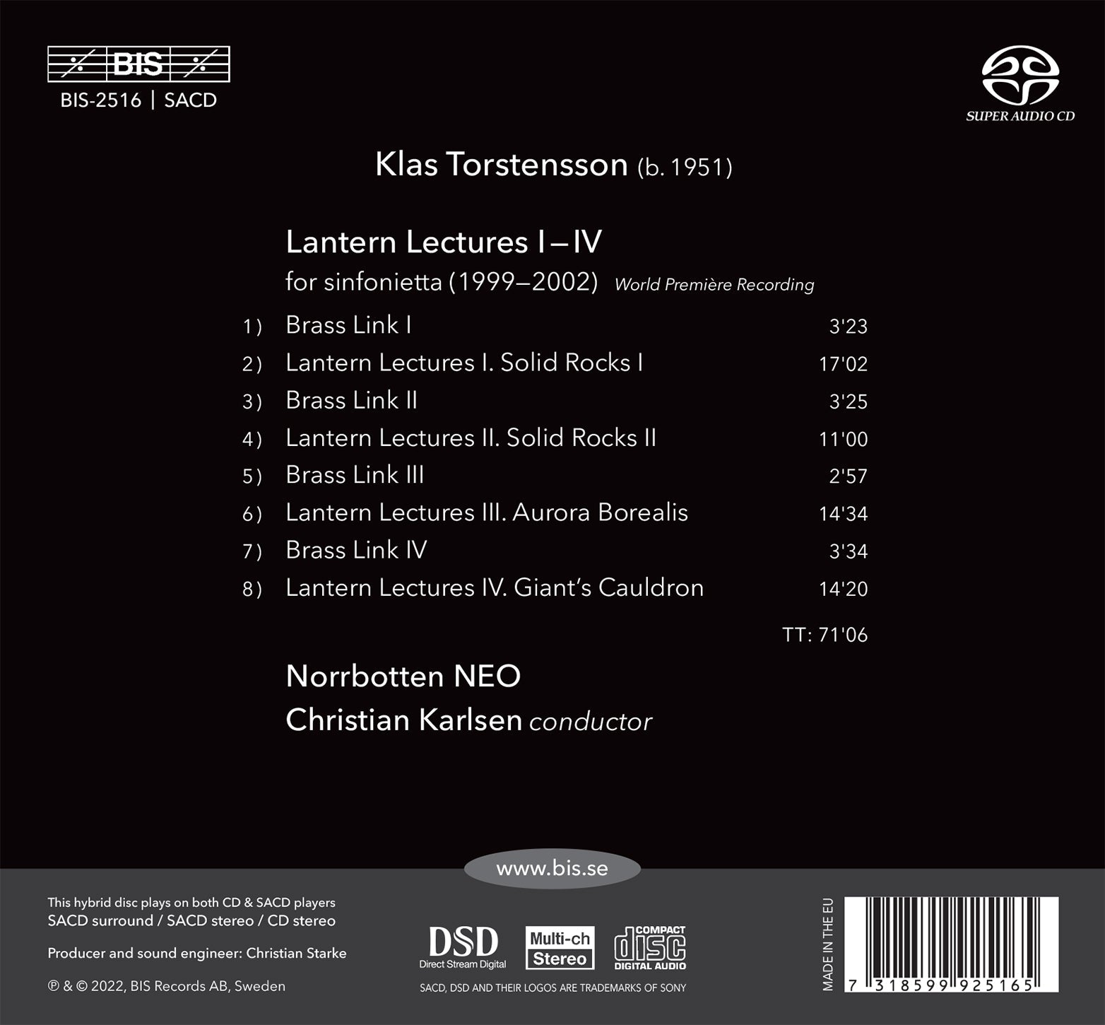 Although born in Sweden, Klas Torstensson has spent most of his working life in the Netherlands following his studies in Utrecht in the early 1970s. Stylistically, he may call to mind Varèse, Xenakis and – perhaps more distantly – Stravinsky. First and foremost, however, Torstensson’s music is personal and distinctive. It is often nourished by his experiences of nature: rough granite, the sea, ice in the frozen Baltic inlets, the polar ice cap. His Lantern Lectures were composed in the aftermath of his opera The Expedition, about an ill-fated journey to the North Pole. While occupied with the opera he had received commissions from several different ensembles, and he therefore decided to write a cycle of works for these ensembles – compositions to be performed separately or as ‘movements’ forming a greater whole. The four lectures portray fundamental elements and phenomena in Nordic nature: bedrock with stratified memories of its violent origins (Solid Rocks I & II), traces of the Northern Lights (Aurora Borealis) and potholes, cylindrical holes drilled into the bedrock under glaciers (Giant’s Cauldron). They all involve 12 to 15 players, and are connected by Brass Links, brief interludes for trumpet, horn and trombone. Lantern Lectures is here performed by Norrbotten NEO, an ensemble dedicated to the promotion of contemporary chamber music, conducted by Christian Karlsen.