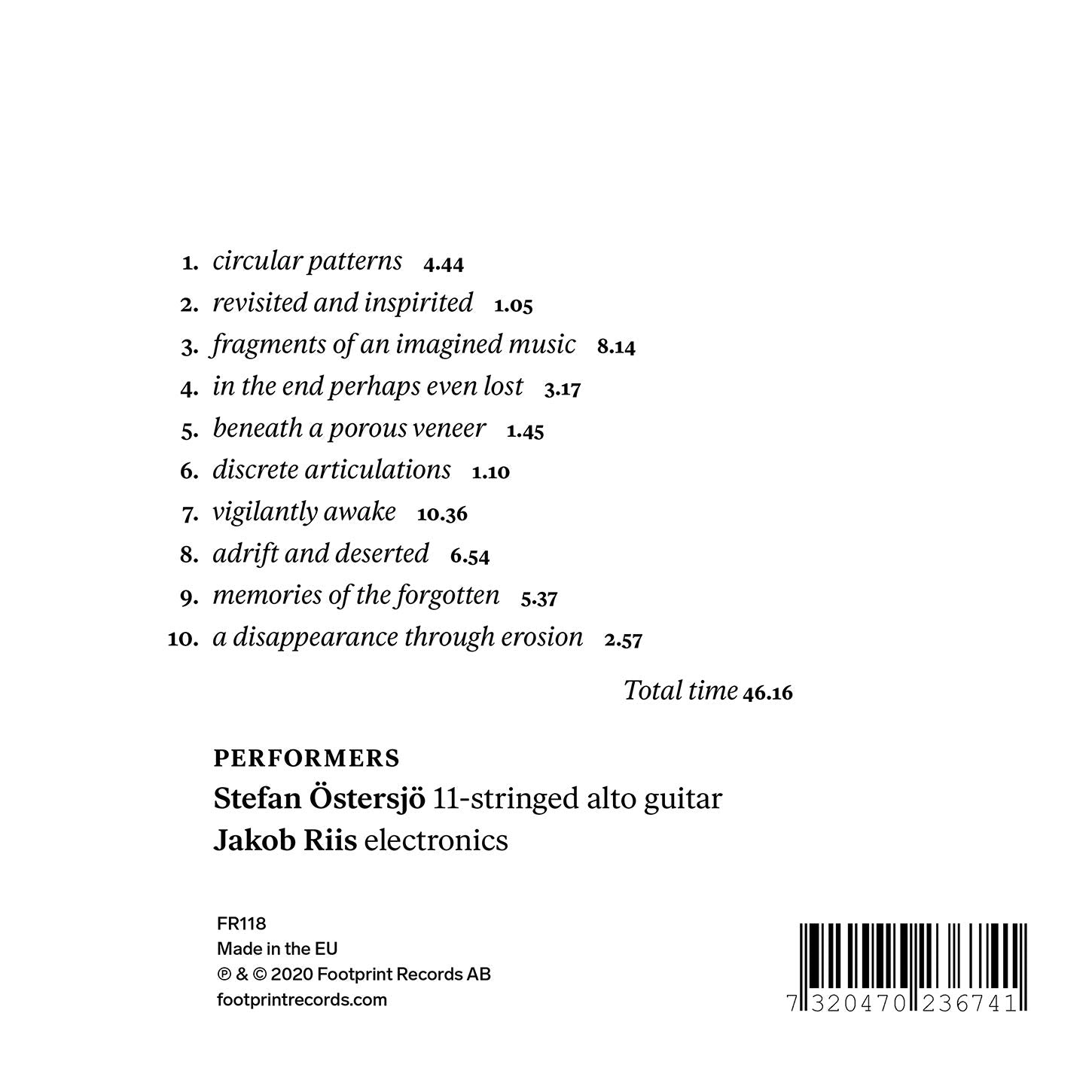 Footprint Records is proud to present our new album Traces of Oblivion, featuring classical guitarist Stefan Östersjö and free-form electronic wizard Jakob Riis. The music borders between improvisation and composition, created in a collaboration between composer Ole Lützow-Holm and Stefan Östersjö. Originally written for Östersjö’s 11-stringed alto guitar, this piece of music has been expanded and developed like a Pandora’s box, with twists and turns over the course of several years. Traces of Oblivion is not a traditional composition with a beginning and end, but rather an archive of sketches and score pages with electronic and acoustic sound recordings. Östersjö and Riis have created a truly singular album based on these raw materials. With careful processing of the guitar’s acoustic sound, strands and traces are woven in twirling arabesques, interrupted by explosive disruptions and ethereal reflections.