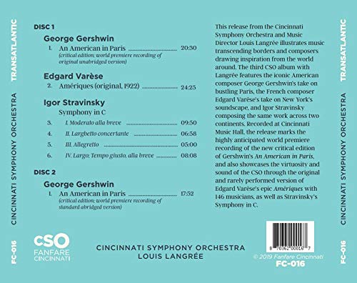 The newest release from the Cincinnati Symphony Orchestra and Music Director Louis Langrée illustrates music transcending borders and composers drawing inspiration from the world around. The third CSO album with Langrée features the iconic American composer George Gershwin’s take on bustling Paris, the French composer Edgard Varèse’s take on New York’s soundscape, and Igor Stravinsky composing the same work across two continents. Recorded at Cincinnati Music Hall, the release marks the highly anticipated world premiere recording of the new critical edition of Gershwin’s An American in Paris, and also showcases the virtuosity and sound of the CSO through the original and rarely performed version of Edgard Varèse’s epic Amériques with 147 musicians, and Stravinsky’s Symphony in C.