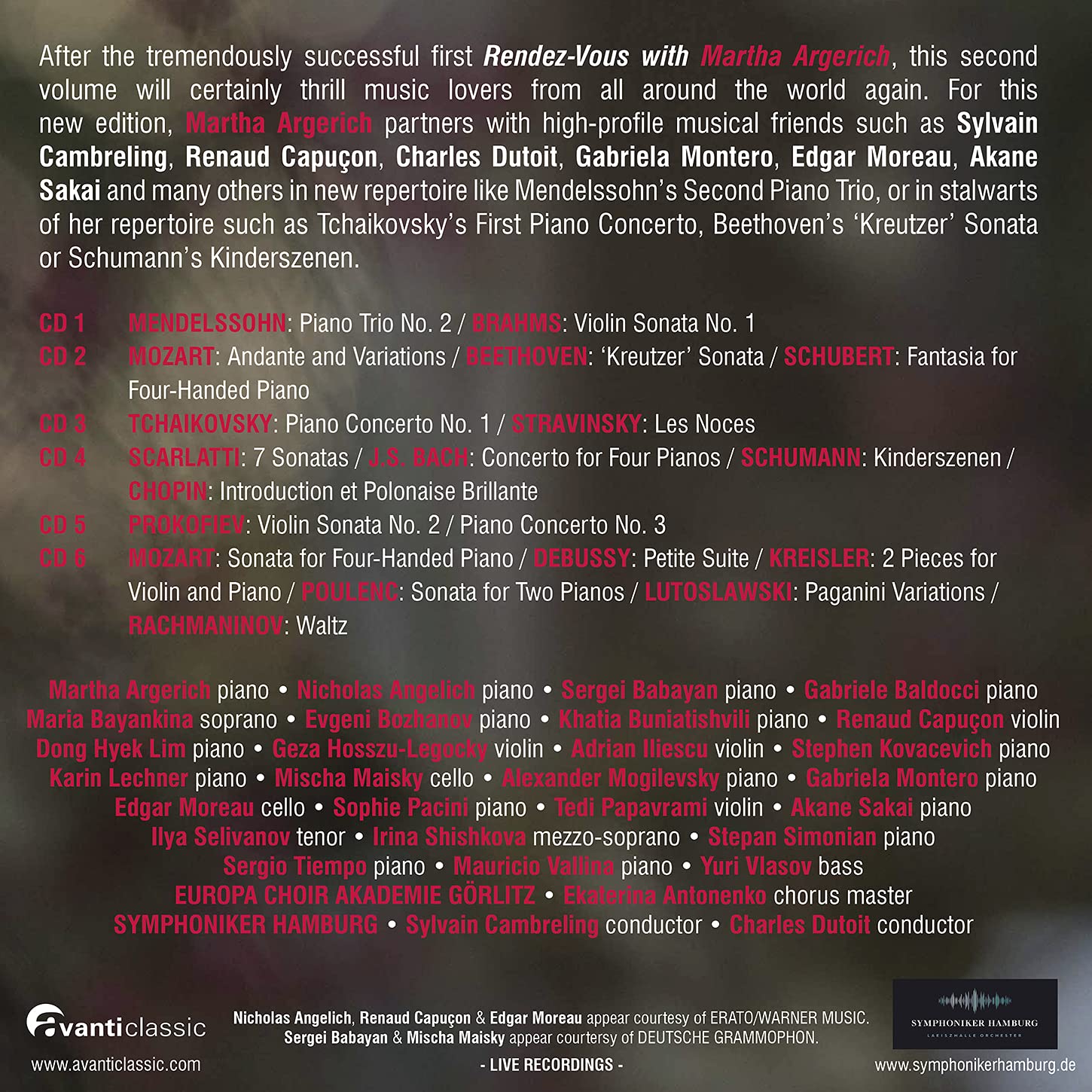 After the tremendously successful first Rendez-Vous with Martha Argerich, this second volume will certainly thrill music lovers from all around the world again. For this new edition, Martha Argerich partners with high-profile musical friends such as Sylvain Cambreling, Renaud Capuçon, Charles Dutoit, Gabriela Montero, Edgar Moreau, Akane Sakai and many others in new repertoire like Mendelssohn’ Second Piano Trio, or in stalwarts of her repertoire such as Tchaikovsky’s First Piano Concerto, Beethoven’s ‘Kreutzer’ Sonata or Schumann’s Kinderszenen. In total: 6 albums that will allow you to marvel at the art of Martha Argerich and her friends in state of the art new recordings.