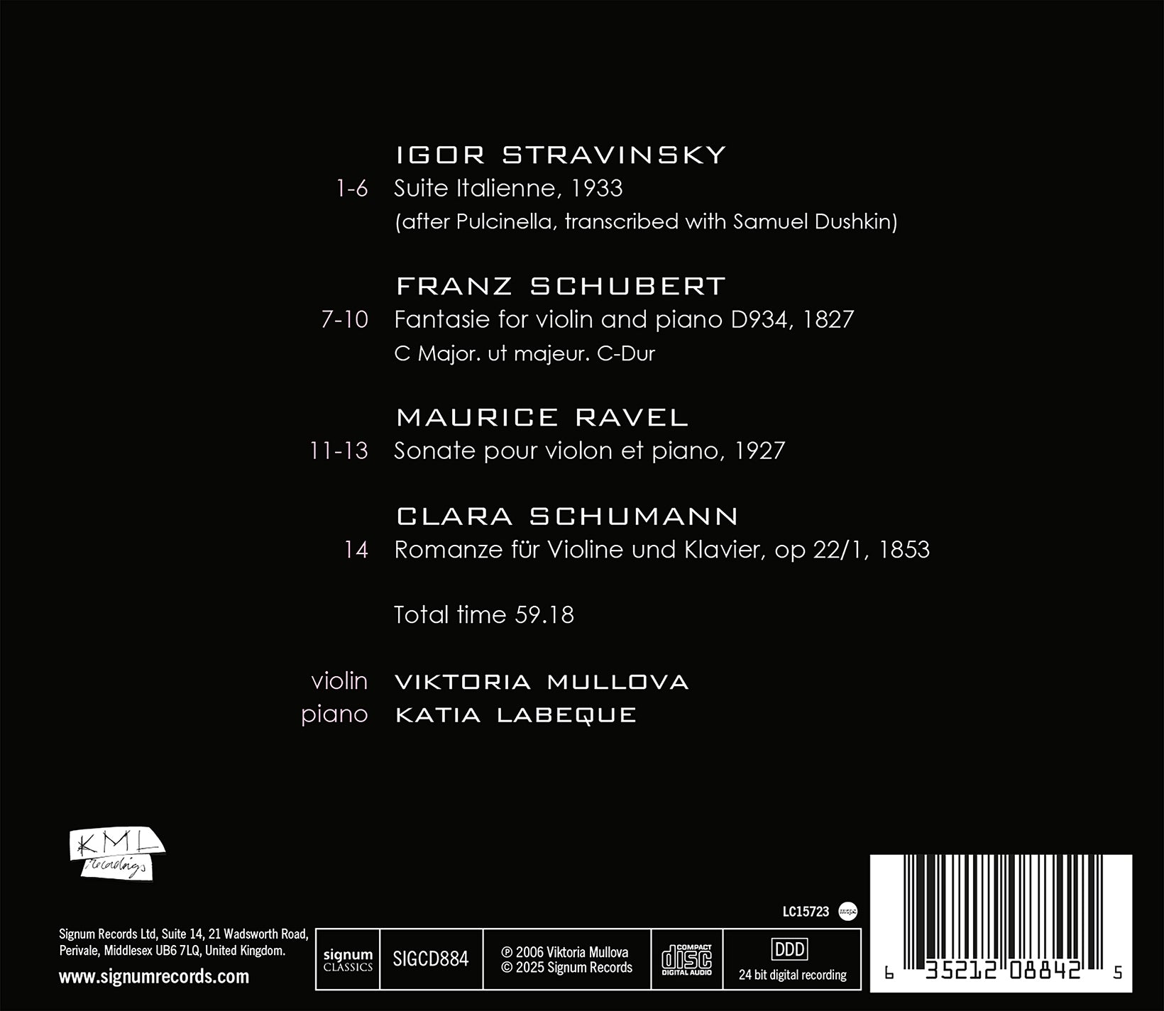 The first collaboration on record of long-time recital partners Viktoria Mullova and Katia Labèque. Ranging from the Schubert Fantasy of 1827 to Stravinsky’s 1933 Suite Italienne, this fascinating programme spans a tremendously exciting 100 years, in which music changed radically, rapidly, and irreversibly. These works demonstrate the massive alterations wrought in those years; the contrast between the Romanticism of Schubert and Clara Schumann, and the innovation of Ravel and Stravinsky. Yet Stravinsky’s use of Baroque music and Ravel’s appropriation of jazz show that the 20th century embraced diverse influences, including those of the past. Viktoria Mullova and Katia Labèque have played this recital together many times, and, as is clear from this recording, relish each composer’s distinctive approach to writing for violin and piano. This is a re-release of the original 2006 production.