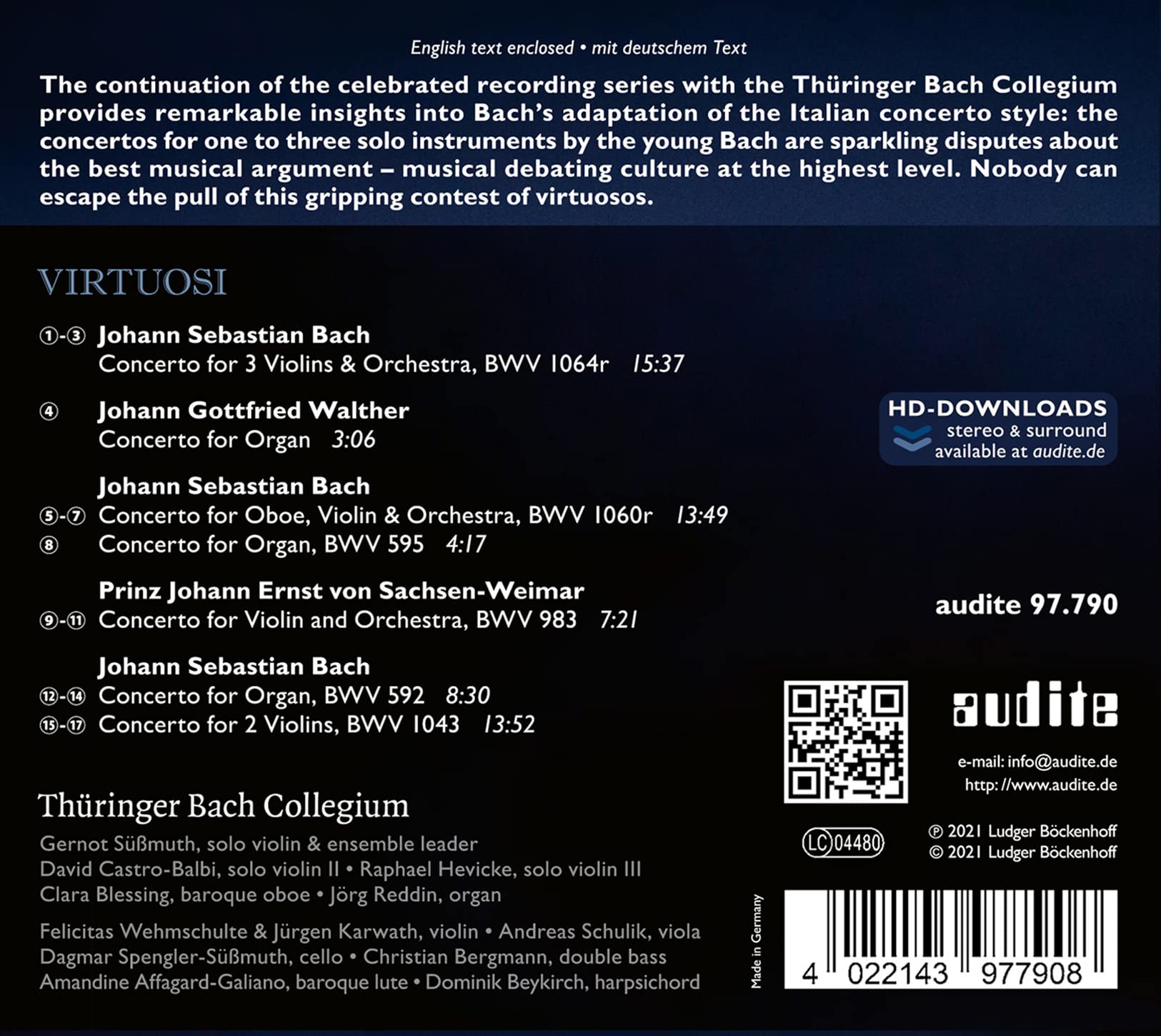 It was a momentous encounter: around 1714, the Weimar court organist Johann Sebastian Bach came across Antonio Vivaldi's Opus 3 L'Estro armonico, hot off the press, and soon nothing was the same for him musically. Bach eagerly appropriates the modern concerto style of the red priest from Venice. And true to the meaning of the word "concertare," which in Italian means "to unite," but in Latin means "to quarrel" or "to fight," Bach soon enters into a contest first with his Italian models and then with himself: Initially, he arranges Vivaldi's violin concertos for his (main) instrument, the organ. But then he implements Vivaldi's principles into his own instrumental concerto style. The result is his immortal Köthen Concertos for one to three solo instruments and orchestra, which fuse the concerto principle of structuring tutti ritornellos and interspersed imaginative solo episodes with Bach's unique skills of polyphonic thinking - highly virtuosic works in which all the participating instruments, as it were, sometimes connect with each other at eye level, sometimes enter into fierce competition with each other. All this can be heard on the third audite recording of the Thuringian Bach Collegium: a good 70 minutes of competition for the best musical arguments, presented with a sparkling virtuosity that no one can resist!
