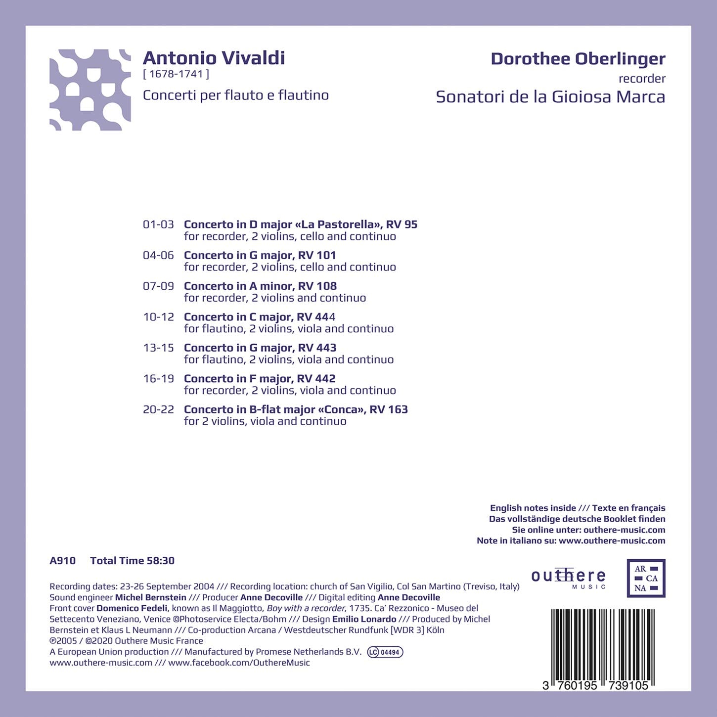 Dorothee Oberlinger writes: “All the recorder concertos on this release – chamber concertos or solo concertos – were written expressly for flauto or flautino and show the imagination, delicacy, freshness, virtuosity and sometimes even melancholy, which Vivaldi put into his writing for this instrument. We have intentionally chosen tuning at 440 Hz since, in Venice, in Vivaldi’s time, tuning was higher than in neighboring musical centers such as Rome, for example, where, at times, one even played at 392 Hz. With this high tuning, the sound of the gentle gut strings becomes clearer and more brilliant.”