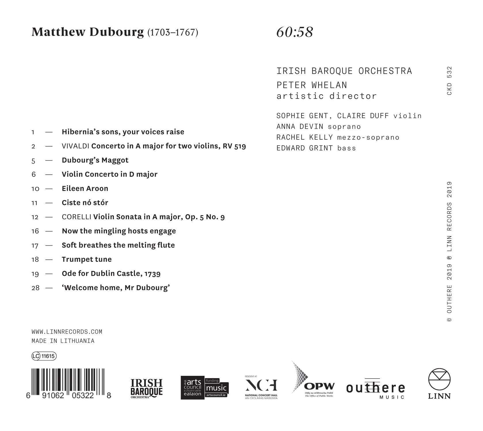 Peter Whelan champions the music of Matthew Dubourg in his recording debut as Artistic Director of the Irish Baroque Orchestra. Dubourg, a pupil of Francesco Geminiani, was a charismatic virtuoso and composer who Whelan believes deserves to be acknowledged as one of Ireland’s most influential musicians. With many of his compositions having only recently come to light, most are presented here for the very first time including the world premiere of the ode ‘Crowned with a more illustrious light’. The eclectic programme showcases a composer whose music is shot-through with humanity, charm, virtuosity and wit. The works includes arrangements of Irish traditional melodies, music written for royal celebrations and virtuosic violin solos in the fashionable Italian style. A Corelli violin sonata and a violin concerto by Vivaldi paint a picture of the musical landscape in which Dubourg’s creativity flourished. This recording is an exciting rediscovery of long forgotten, but truly wonderful, music from Ireland’s past.