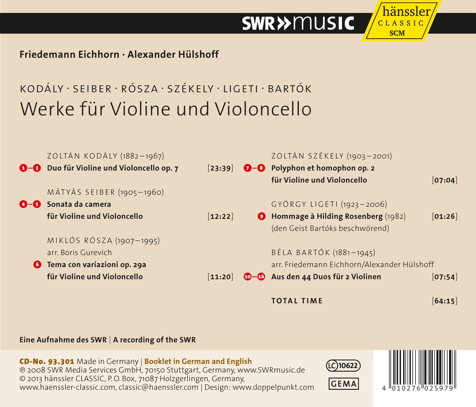 Composer: KODALY SEIBER ROSZA BARTOK