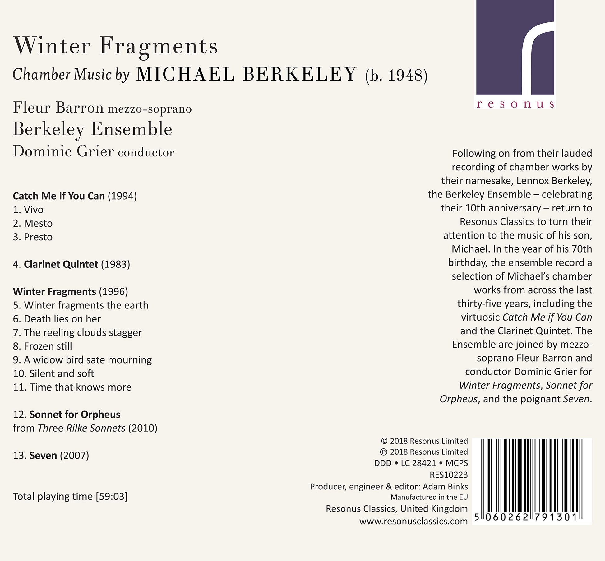 Following on from their lauded recording of chamber works by their namesake, Lennox Berkeley, the Berkeley Ensemble, celebrating their tenth anniversary, return to Resonus Classics to turn their attention to the music of his son, Michael. In the year of his seventieth birthday, the ensemble record a selection of Michael’s chamber works from across the last thirty-five years, including the virtuosic ‘Catch Me If You Can’ and the Clarinet Quintet. The ensemble is joined by mezzo-soprano Fleur Barron and conductor Dominic Grier for ‘Winter Fragments,’ ‘Sonnet for Orpheus,’ and the poignant ‘Seven.’ Hailed as ‘an instinctive collective’ (The Strad) the Berkeley Ensemble was formed with the aim of exploring little-known twentieth and twenty-first century British chamber music alongside more established repertoire. It now enjoys a busy concert schedule performing throughout the UK and abroad, and is also much in demand for its inspiring work in education.