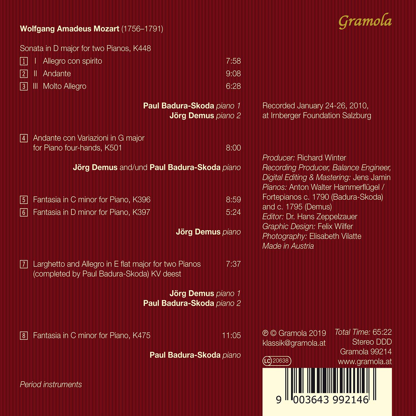 On this new recording, two legendary Viennese pianists, Paul Badura-Skoda und Jörg Demus, devote themselves to works by Mozart for solo piano, four-handed piano and for two pianos, such as the well-known D major Sonata for Two Pianos KV 448. Besides the 'Larghetto and Allegro' for 2 Pianos, which was only discovered in 1963, and the Variations in G Major for Fourhanded Piano KV 501, the two pianists, who play on historical Walter fortepianos (and also wrote the texts in the booklet), share Mozart's three famous fantasias for solo piano - Demus playing the two Fantasias in C minor and D minor KV 396 and 397 and Badura-Skoda the great Fantasia in C minor KV 475.