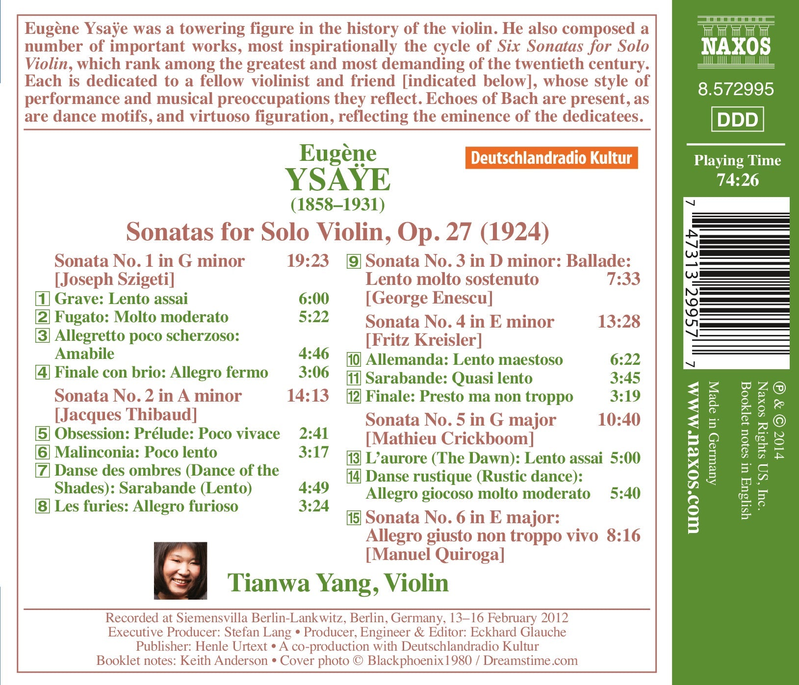 Fresh from her recorded triumphs in Sarasate and Mendelssohn, Tianwa Yang negotiates the musical and technical chicanery of Ysaÿe’s six solo Sonatas with great aplomb. Even bearing in mind outstanding accounts by [others], Yang’s rare ability to sustain a convincing emotional narrative in these elusive scores proves highly compelling. Completely unfazed by Ysaÿe’s near-constant Bachian cross-referencing and mild harmonic astringencies, she moulds even the most challenging of phrases with a dedicated sensitivity and affectionate warmth.