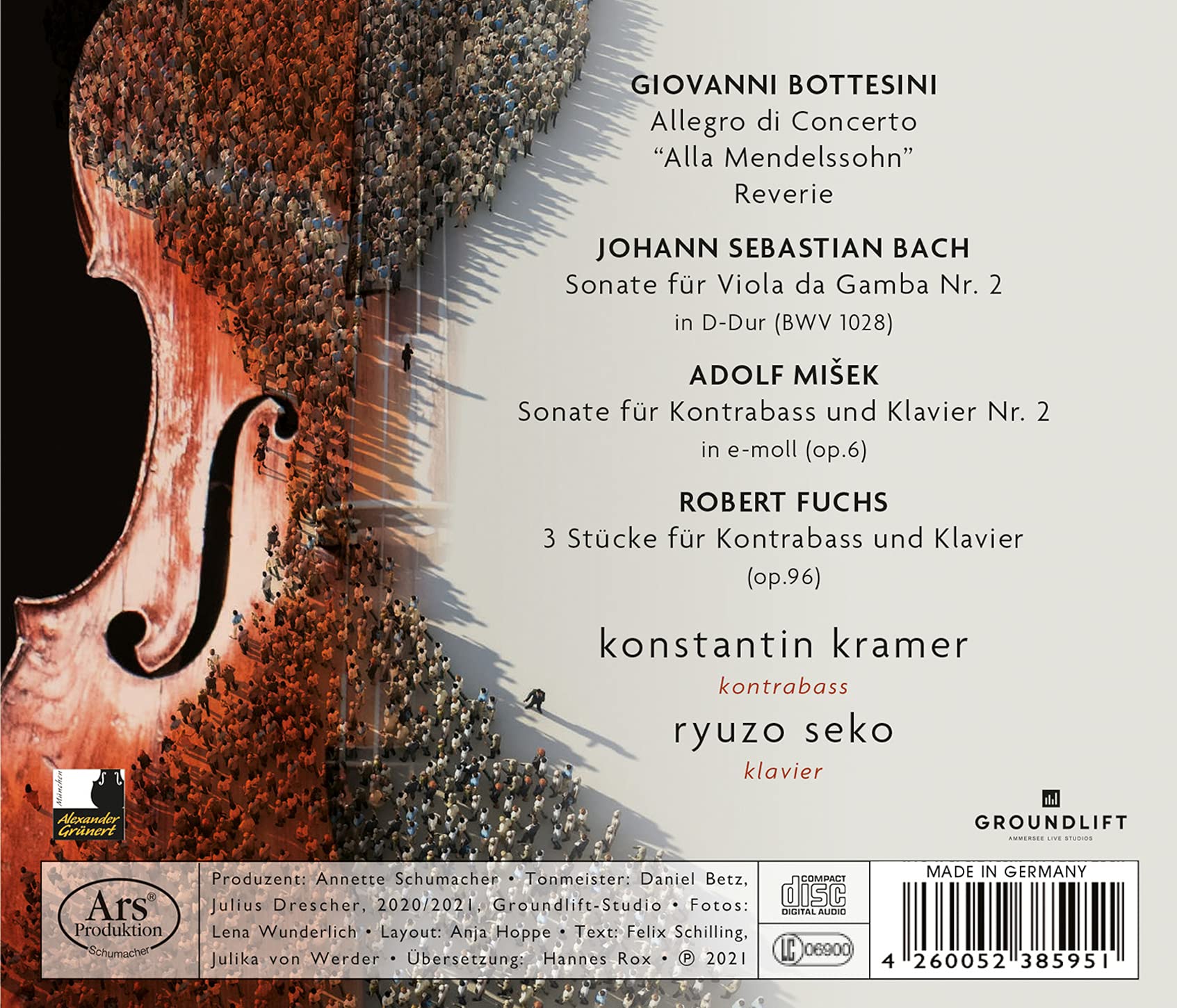 Konstantin Kramer has taken time (ZEIT): the recordings have "kept him alive" throughout the Corona year. They have saved him over time. They made him come to himself and forced him to deal with himself and his available time. They have helped him channel his anger and frustration. But they have also made him realize his love and passion for music and his double bass, and confirmed to him that all the time he has invested over the last few years has not been in vain.... Giovanni Bottesini's "Allegro di Concerto Alla Mendelssohn" and "Rêverie" are among the most beautiful compositions for the double bass as a solo instrument. The works are not only expressive and original, but represented a quantum leap in tonal variety and technical sophistication. Like no one else to this day, Bottesini ensured that the lowest of all string instruments conquered the concert stages as a concert solo instrument... The works of Czech composer and double bassist Adolf Míšek have formed an important part of the original repertoire for decades as the culmination of the Romantic double bass literature. In his second double bass sonata of 1910, influences of Czech folk music can be noticed... Johann Sebastian Bach most likely never experienced the double bass as a concertante solo instrument. The Sonata in D major, which he actually composed for viola da gamba and harpsichord, is one of the most popular performance pieces for the modern double bass today.... "Robert Fuchs is a fabulous musician, everything is so fine and so deft, so delightfully invented!" raved Johannes Brahms about his colleague Robert Fuchs. And rightly so: the Austrian composer is one of the true Romantics of music history.