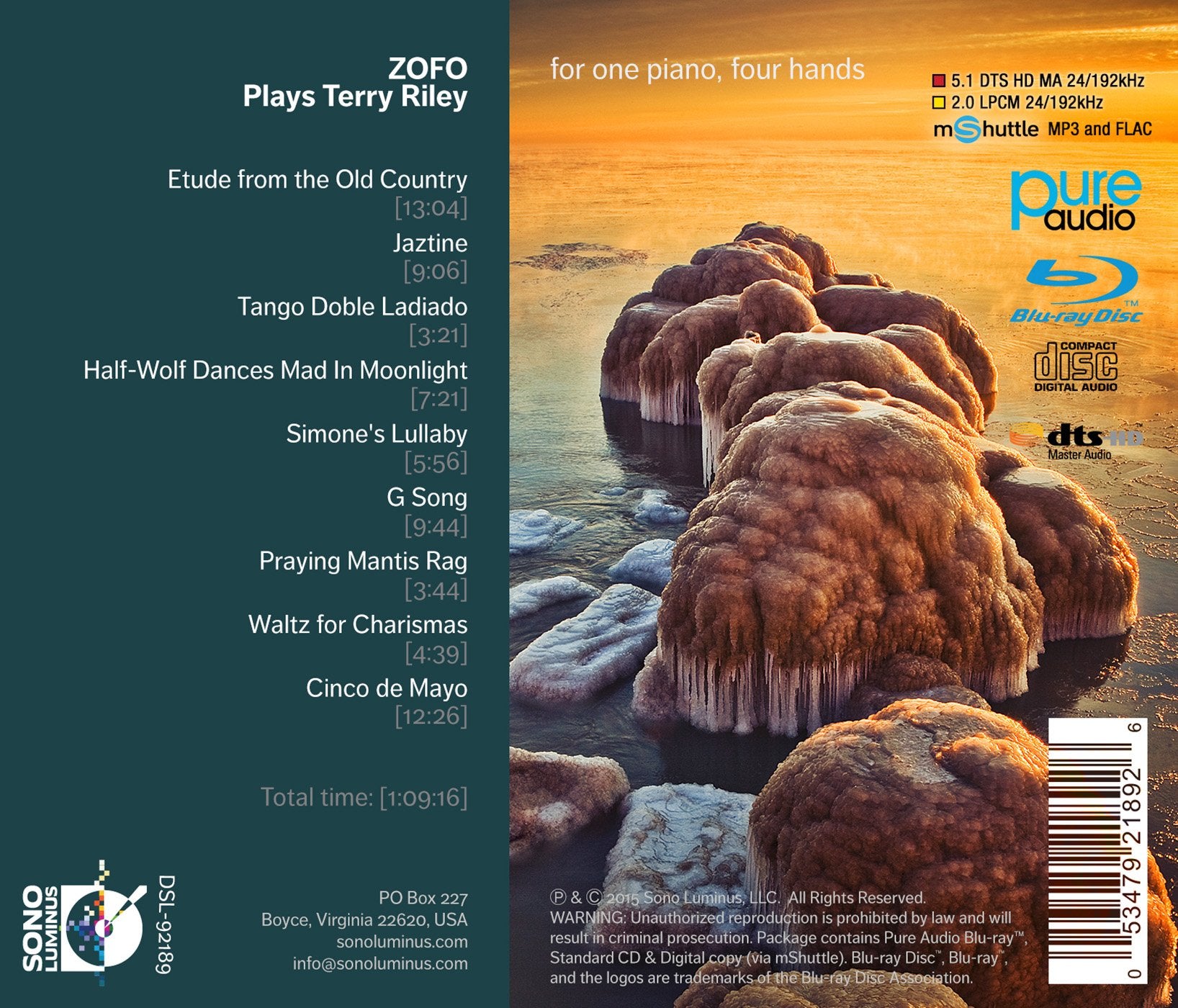 ZOFO – pianists Eva-Maria Zimmermann and Keisuke Nakagoshi –is at it again, this time with an all Terry Riley album that includes original compositions, arrangements and a special commission by the duet.From the very beginning, Terry Riley worked in collaboration with ZOFO in the making of this album.Mr. Riley himself said: “There is nothing quite like hearing the full 8 octaves of a piano sounding in all its orchestral richness.”He certainly makes full use of the sounds of the piano in the pieces originally written for piano two hands, from The Heaven Ladder Book 5.Keisuke arranged G Song and Half-Wolf Dances at Moonlight, originally composed for string quartet, and Eva arranged Simone’s Lullaby, originally for solo piano.The Praying Mantis Rag was composed especially for ZOFO to illustrate the duo’s vibrant character.“...jaw-dropping awesome!” (San Francisco Examiner)(...energetically and electrifyingly out of this world” (Bachtrack)“One of the most enthralling piano duets of today's millennial generation...” (San Francisco Classical Voice)
